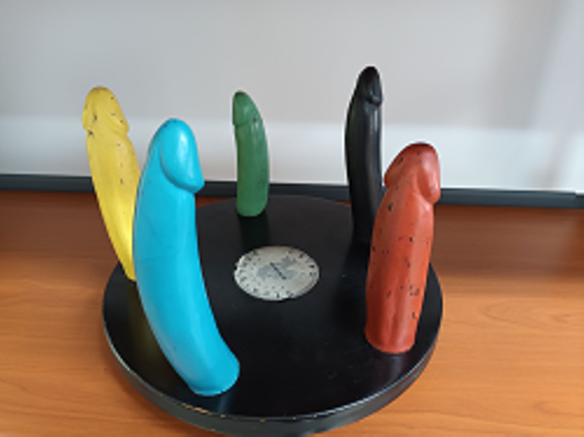 Description/ résumé : Le manège enchanté est un plateau tournant sur lequel sont disposés cinq phallus en résine, de tailles et de couleurs différentes.