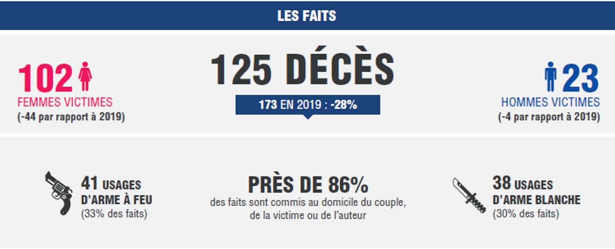 En 2020, 125 morts violentes au sein du couple ont été recensées par les services de police et unités de gendarmerie, contre 173 l’année précédente (48 victimes en moins, soit -28 %).