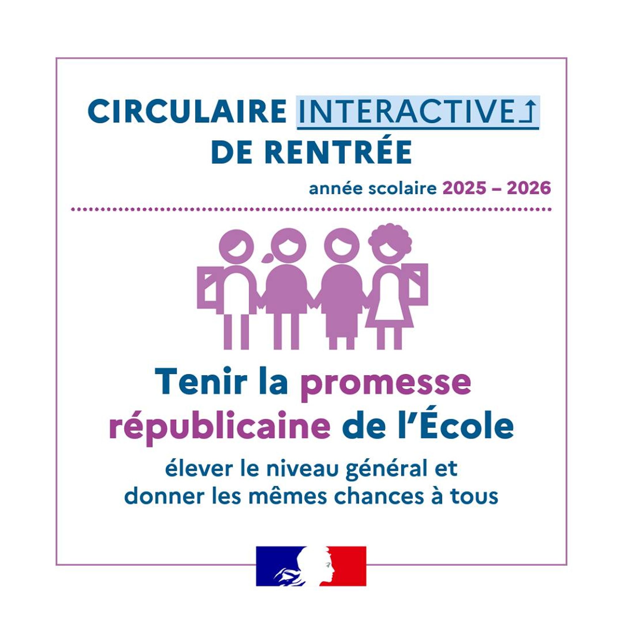 Publiée au Bulletin officiel du 03 juillet 2025, la circulaire de rentrée 2025 détaille les priorités pour l'année scolaire 2025-2026 pour « Tenir la promesse de républicaine de l'école: Elever le niveau général et donner les mêmes chances à tous ». Actualité Vie-publique.fr (août 2025).
