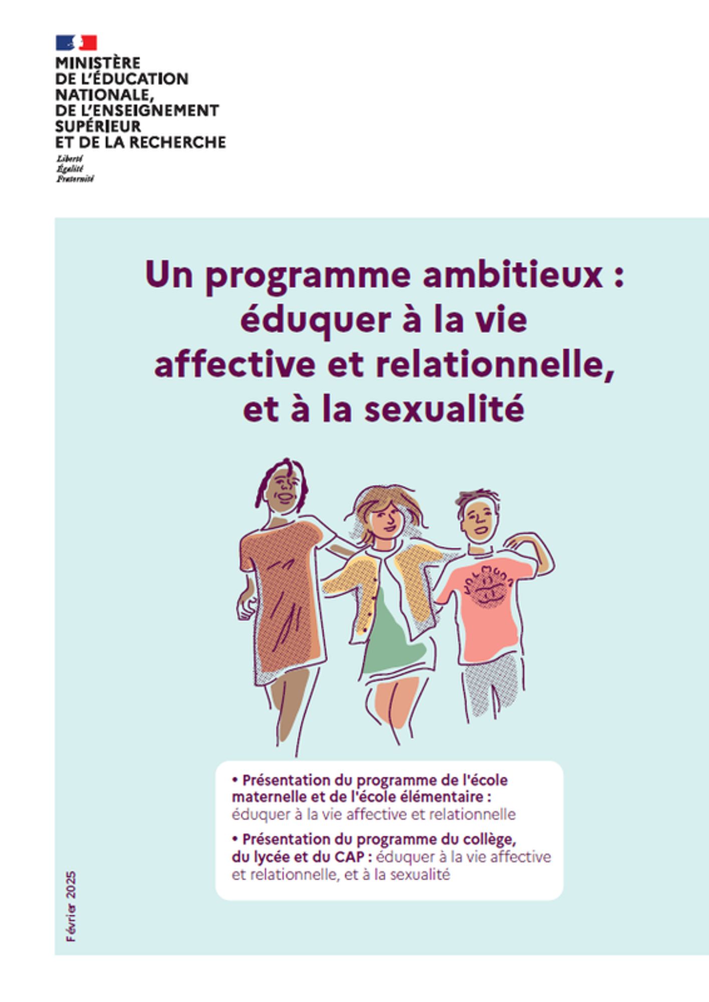Publié le 12 février 2025, ce premier programme d'éducation à la vie affective et relationnelle, et à la sexualité (EVARS) proposé par le ministère de l'Éducation nationale et applicable à partir de septembre 2025, vise à sensibiliser les élèves sur des sujets liés à la santé et au bien-être, et à les préparer à une citoyenneté éclairée.... Il s'articule en deux volets complémentaires. Le premier, destiné aux élèves de l'école maternelle et élémentaire, porte sur l'éducation à la vie affective et relationnelle. Le second, qui concerne le collège et le lycée, approfondit ces notions en y intégrant l'éducation à la sexualité.
