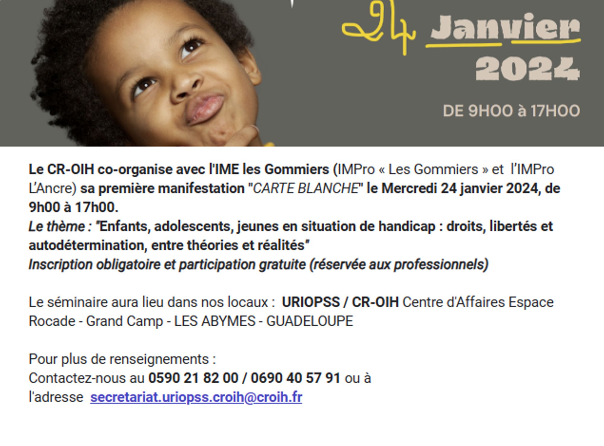 Invitation : Journée de sensibilisation et d'analyse des pratiques sur le thème: Enfants, adolescents, jeunes en situation de handicap : Droits, Libertés et Autodétermination, entre théories et réalités - CR-OIH /URIOPSS