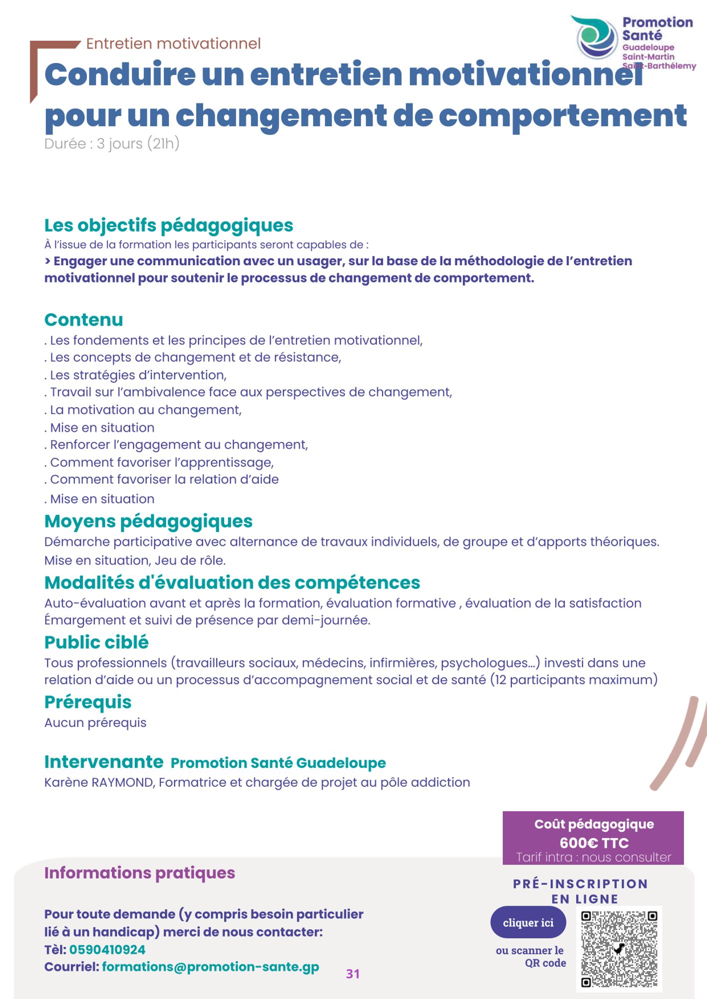 Pour toute spécificité personnelle liée à un handicap ou à un besoin particulier, veuillez vous préinscrire à la formation puis envoyer un mail à referenthandicap@promotion-sante.gp au minimum 3 semaines avant la formation intégrant :