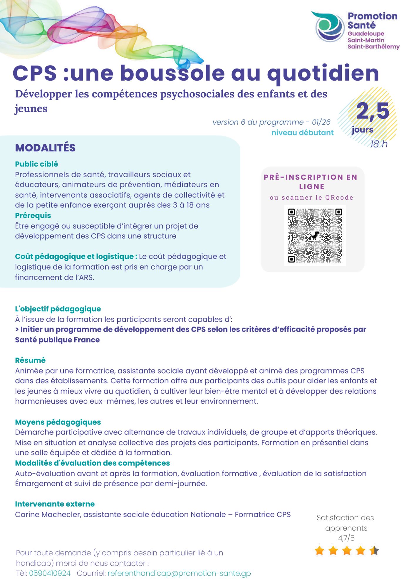 Pour toute spécificité personnelle liée à un handicap ou à un besoin particulier, veuillez vous préinscrire à la formation puis envoyer un mail à referenthandicap@promotion-sante.gp au minimum 3 semaines avant la formation intégrant :
