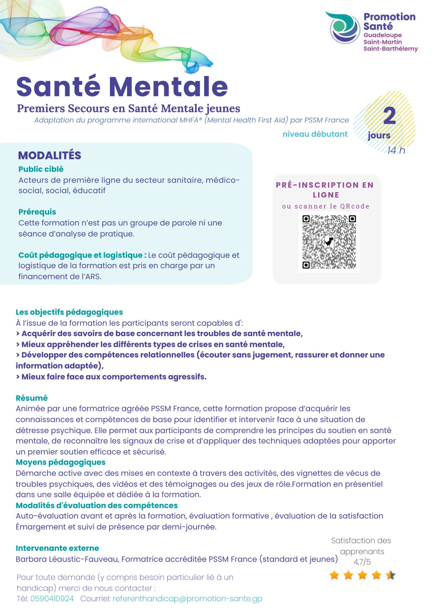 Pour toute spécificité personnelle liée à un handicap ou à un besoin particulier, veuillez vous préinscrire à la formation puis envoyer un mail à referenthandicap@promotion-sante.gp au minimum 3 semaines avant la formation intégrant :