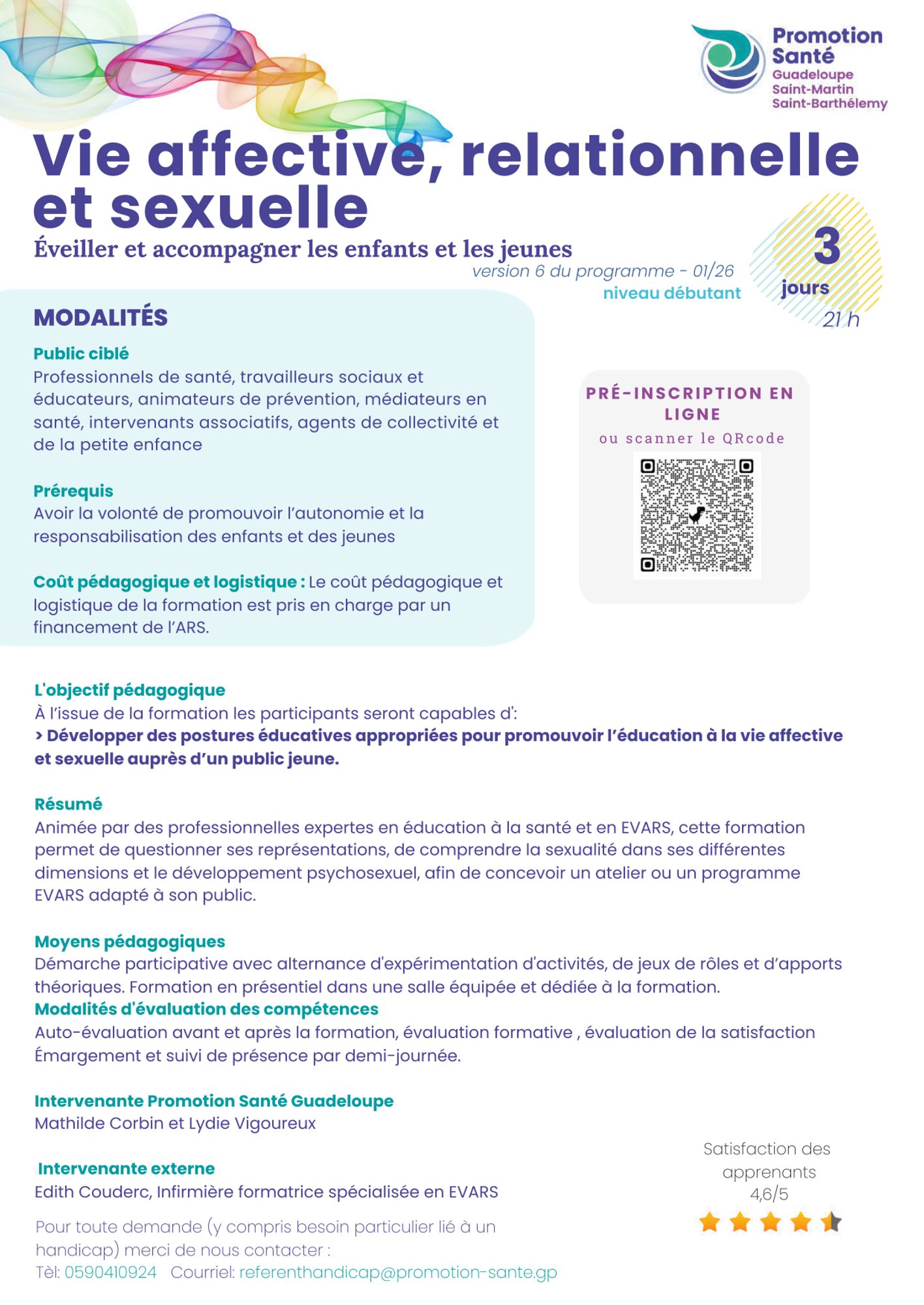 Pour toute spécificité personnelle liée à un handicap ou à un besoin particulier, veuillez vous préinscrire à la formation puis envoyer un mail à referenthandicap@promotion-sante.gp au minimum 3 semaines avant la formation intégrant :