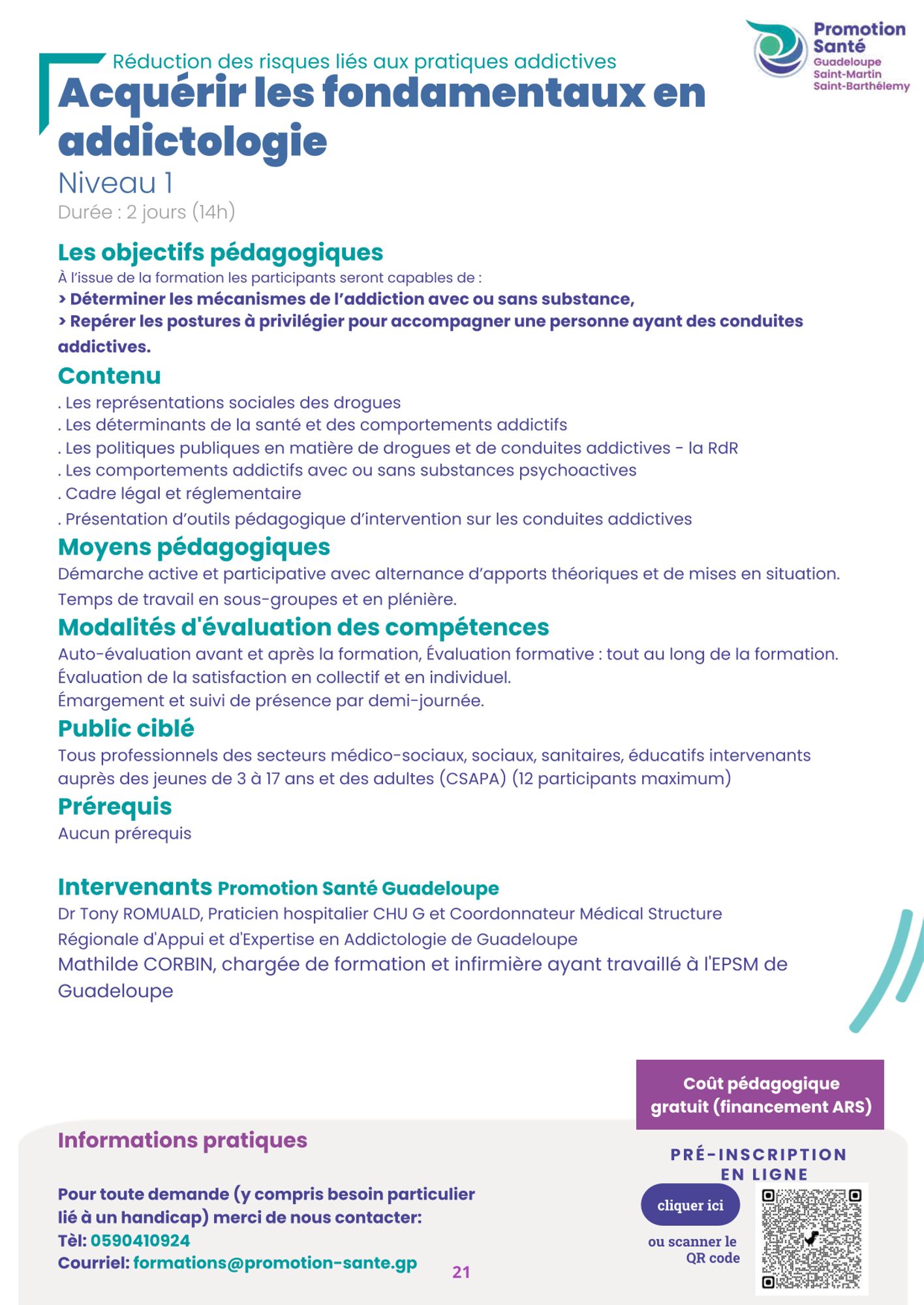 Pour toute spécificité personnelle liée à un handicap ou à un besoin particulier, veuillez vous préinscrire à la formation puis envoyer un mail à referenthandicap@promotion-sante.gp au minimum 3 semaines avant la formation intégrant :