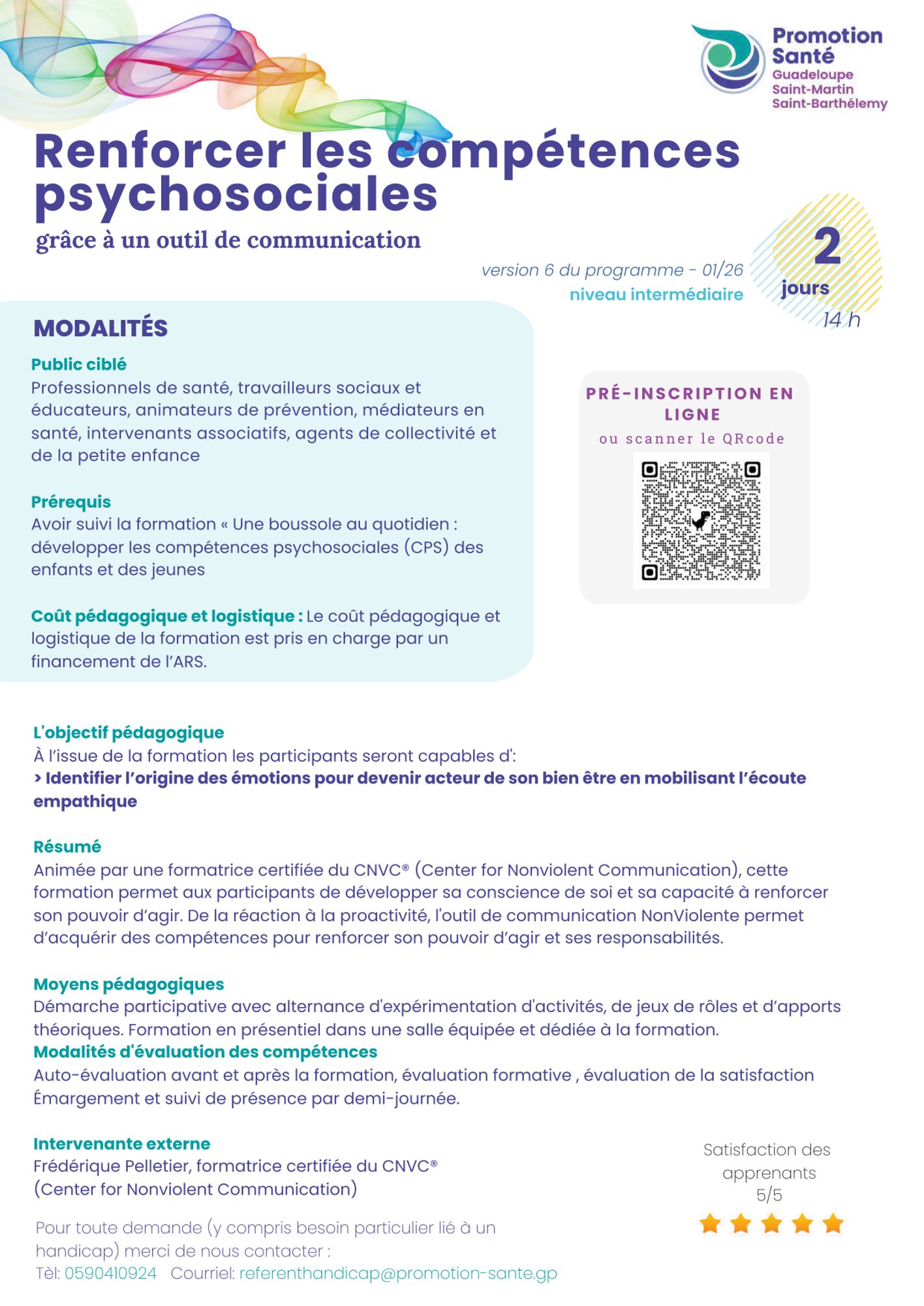 Pour toute spécificité personnelle liée à un handicap ou à un besoin particulier, veuillez vous préinscrire à la formation puis envoyer un mail à referenthandicap@promotion-sante.gp au minimum 3 semaines avant la formation intégrant :
