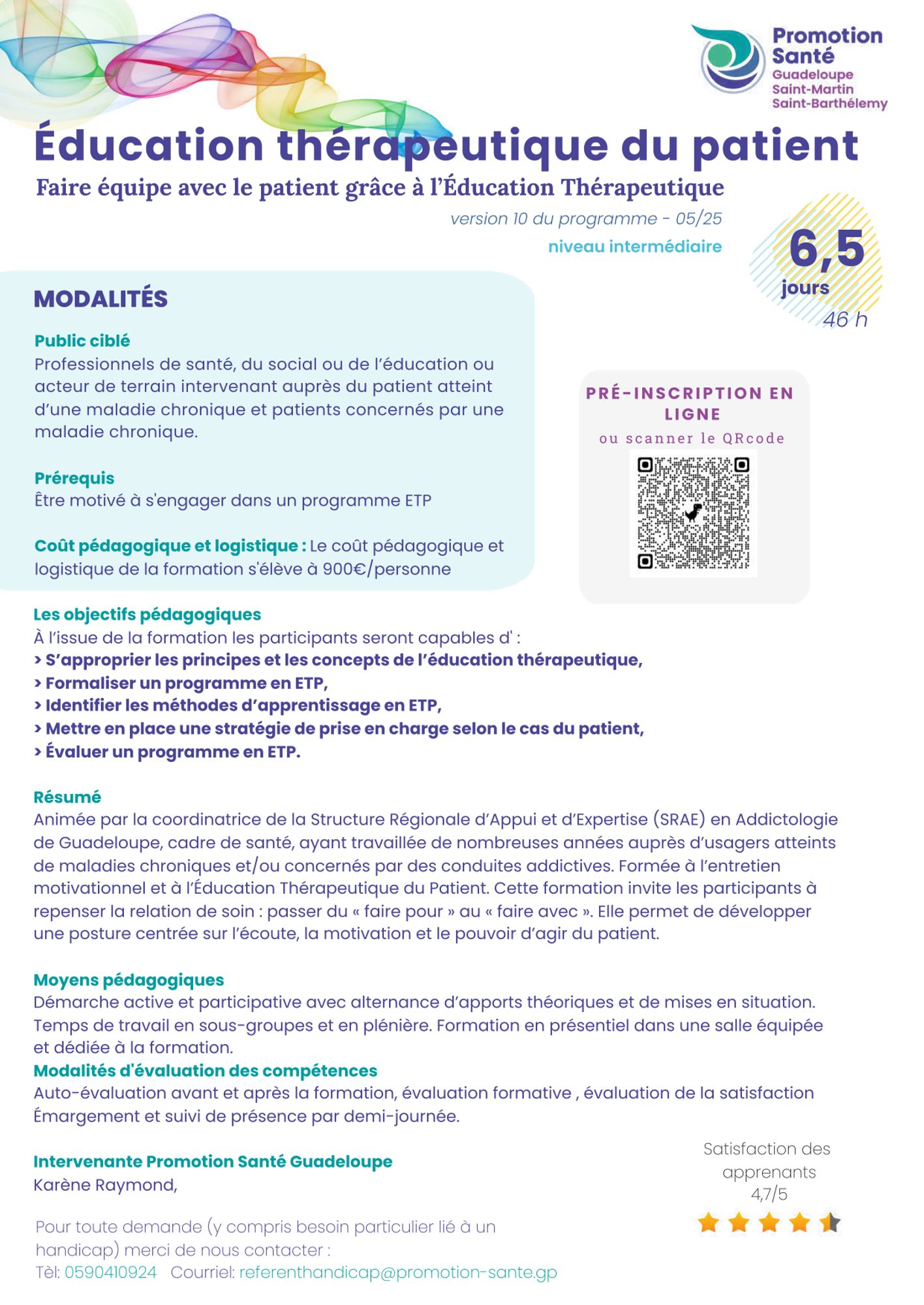 Animée par la coordinatrice de la Structure Régionale d’Appui et d’Expertise (SRAE) en Addictologie de Guadeloupe, cadre de santé, ayant travaillée de nombreuses années auprès d’usagers atteints de maladies chroniques et/ou concernés par des conduites addictives. Formée à l’entretien motivationnel et à l’Éducation Thérapeutique du Patient. Cette formation invite les participants à repenser la relation de soin : passer du « faire pour » au « faire avec ». Elle permet de développer une posture centrée sur l’écoute, la motivation et le pouvoir d’agir du patient.