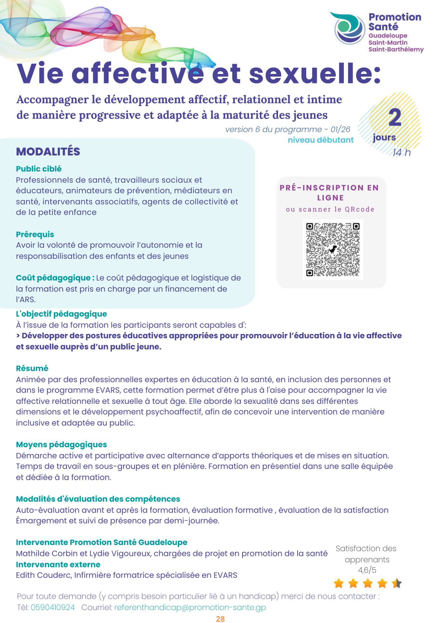 Pour toute spécificité personnelle liée à un handicap ou à un besoin particulier, veuillez vous préinscrire à la formation puis envoyer un mail à referenthandicap@promotion-sante.gp au minimum 3 semaines avant la formation intégrant :