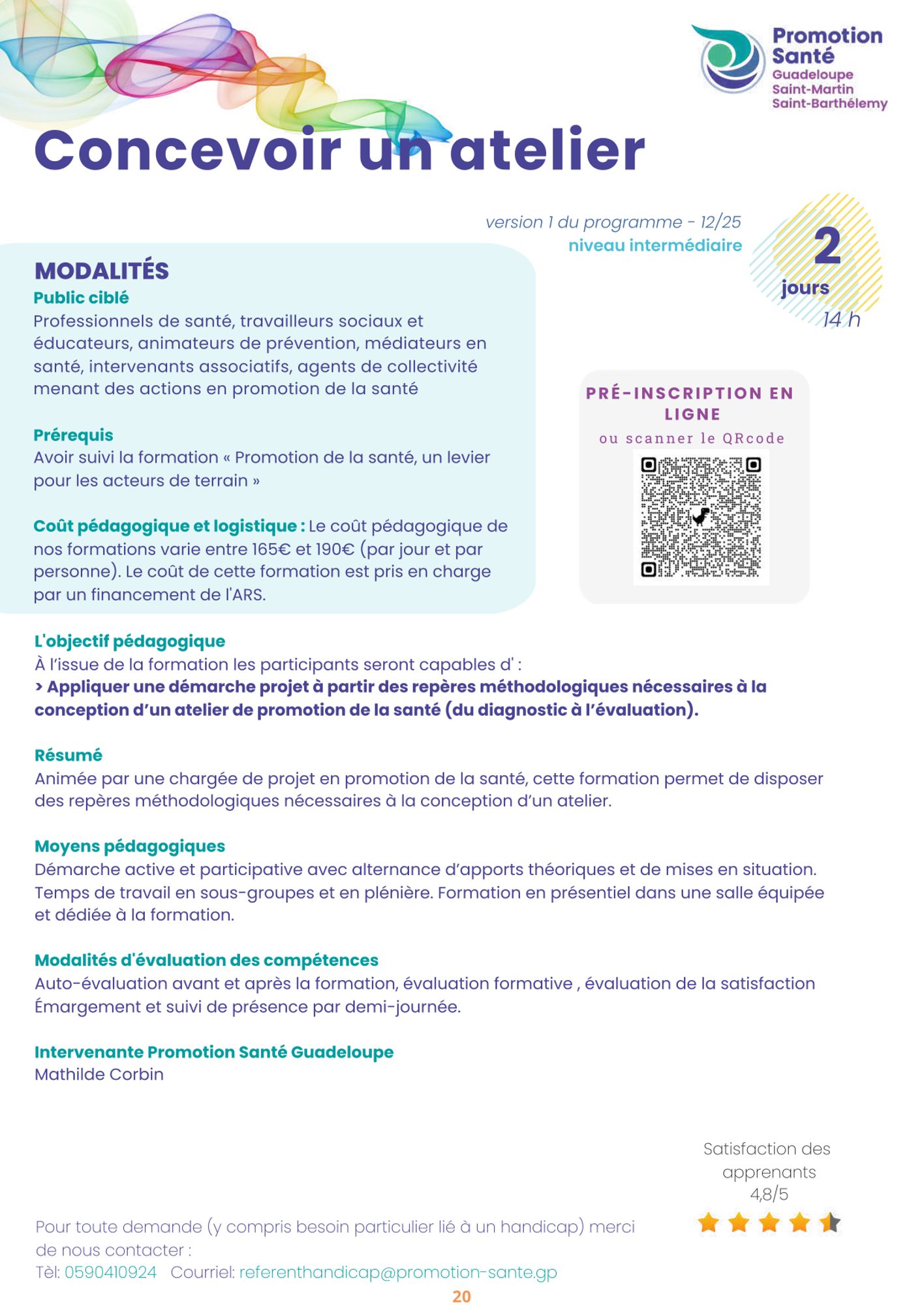 Pour toute spécificité personnelle liée à un handicap ou à un besoin particulier, veuillez vous préinscrire à la formation puis envoyer un mail à referenthandicap@promotion-sante.gp au minimum 3 semaines avant la formation intégrant :