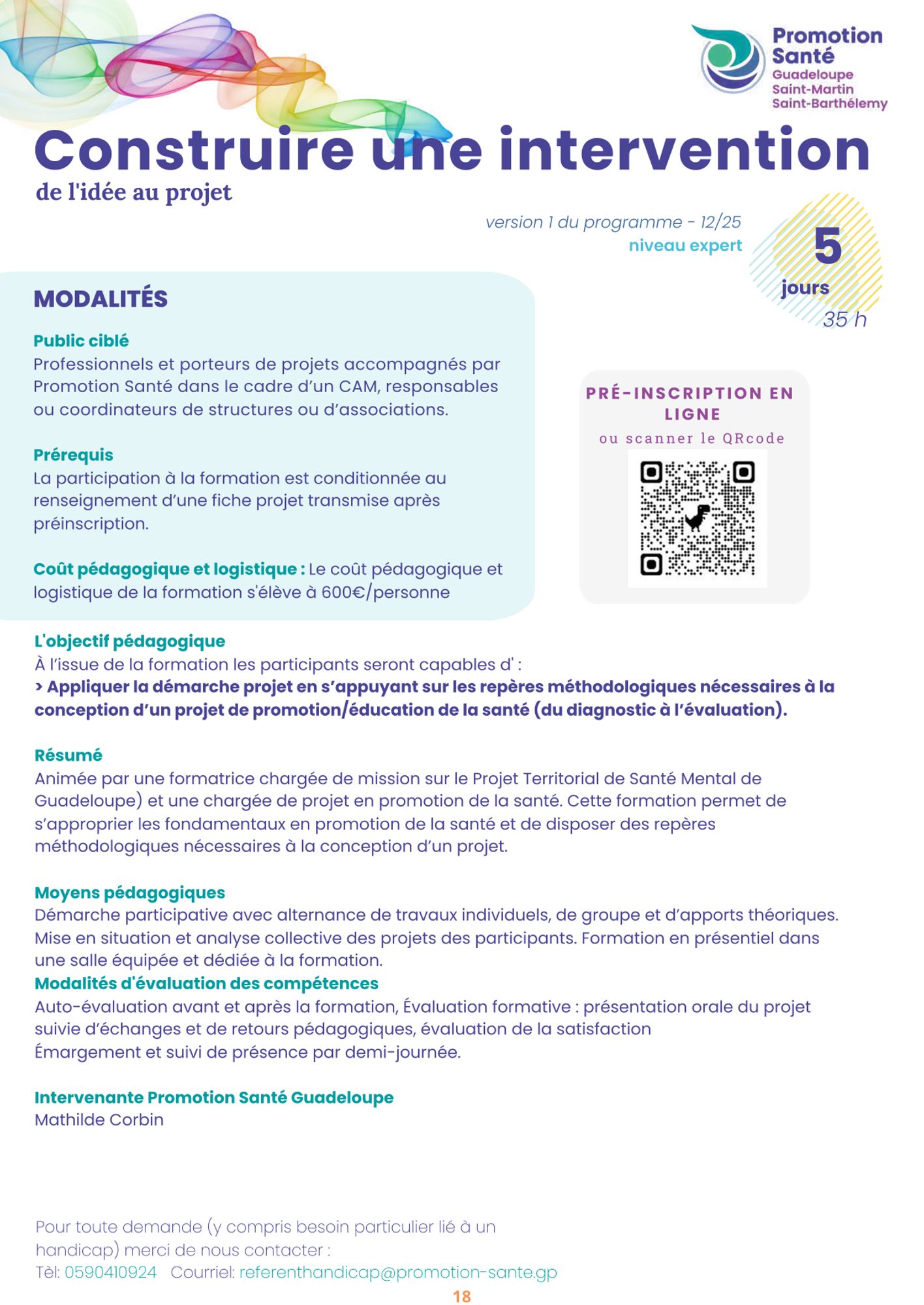 Animée par une formatrice chargée de mission sur le Projet Territorial de Santé Mental de Guadeloupe) et une chargée de projet en promotion de la santé. Cette formation permet de s’approprier les fondamentaux en promotion de la santé et de disposer des repères méthodologiques nécessaires à la conception d’un projet.