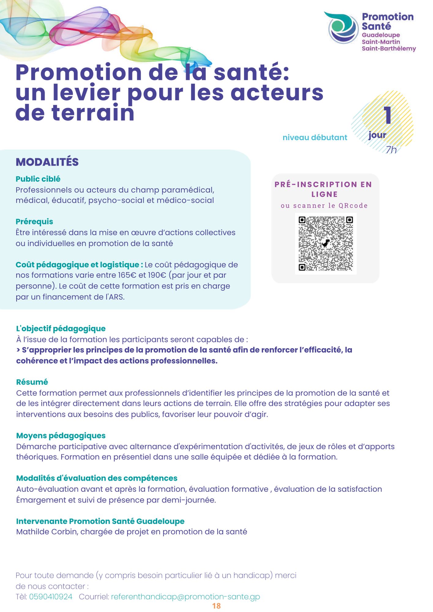 Pour toute spécificité personnelle liée à un handicap ou à un besoin particulier, veuillez vous préinscrire à la formation puis envoyer un mail à referenthandicap@promotion-sante.gp au minimum 3 semaines avant la formation intégrant :