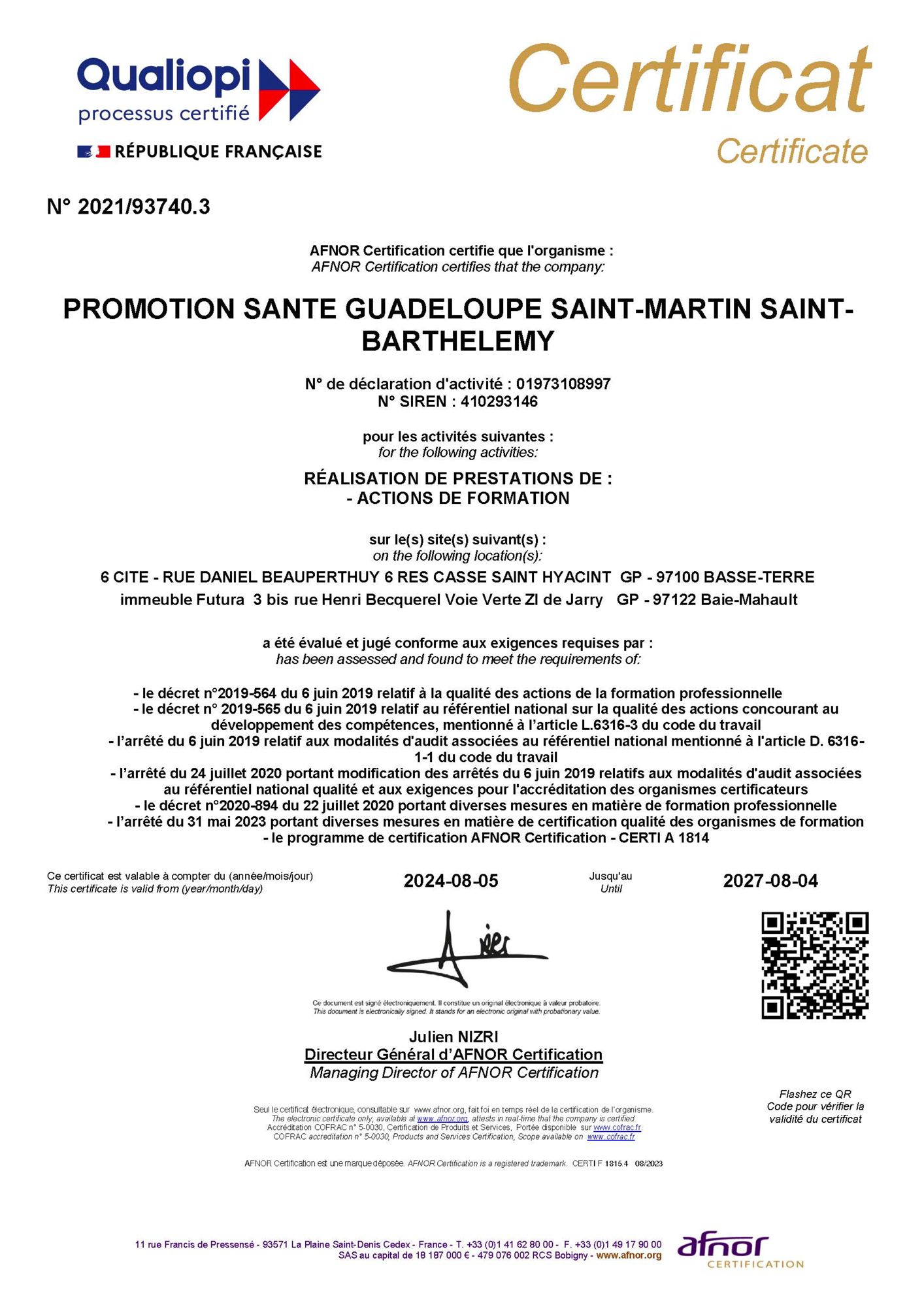 Certifié Qualiopi depuis 2021, le Pôle Formation de Promotion Santé Guadeloupe, Saint-Martin, Saint-Barthélemy a renouvelé sa certification en 2024 pour ses actions de formations. Le label Qualiopi atteste du niveau de qualité des formations, de nos intervenants et de la démarche d’amélioration continue engagée par notre structure.
