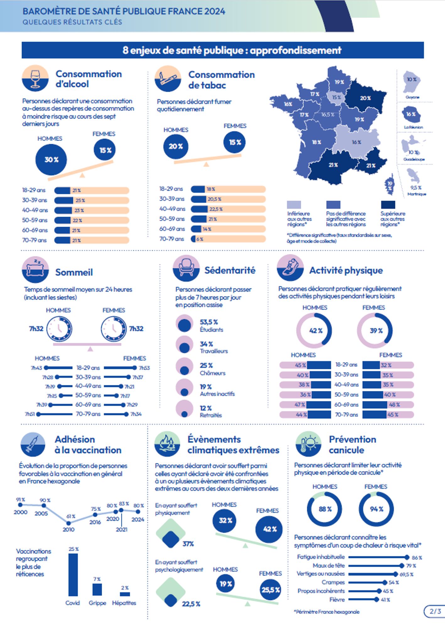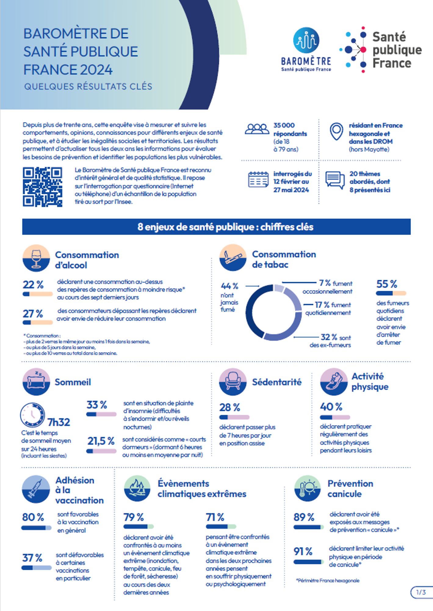 Résumé: Avec 35 000 personnes interrogées, l’édition 2024 du Baromètre de Santé publique France recueille des données sur 20 grands enjeux de santé publique, tels que la consommation de tabac et d’alcool, la pratique d’activité physique, le sommeil, l’adhésion à la vaccination, la santé mentale, etc.