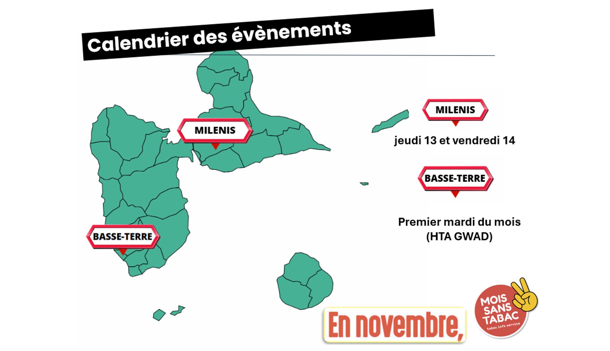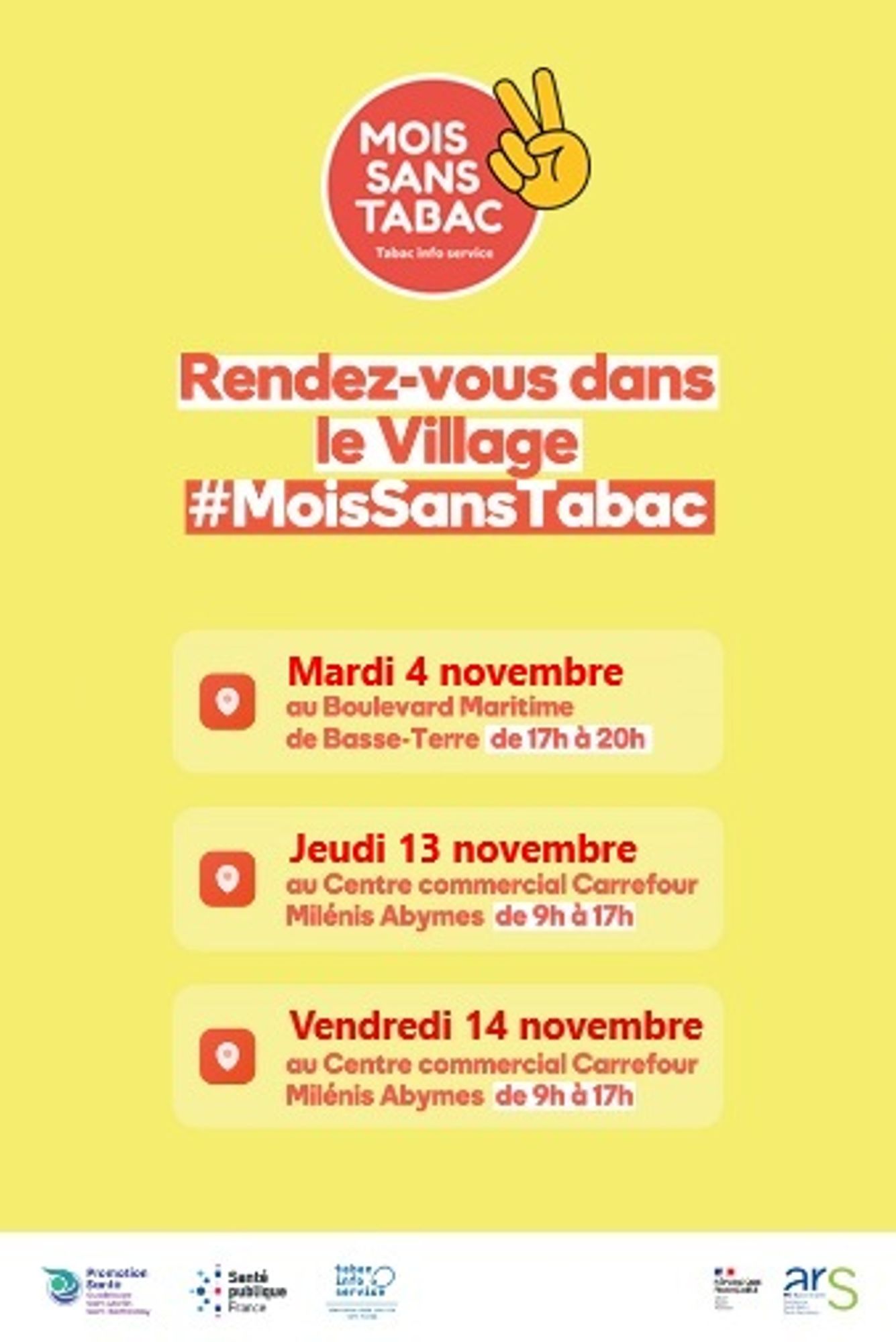 En Guadeloupe, Promotion Santé, la CGSS , l'Agence Régionale de Santé, les CSAPA et les professionnels de santé unissent leurs forces pour proposer des actions de terrain déployées pour être au plus proche des fumeurs. Comme partout en France, des stands Mois sans tabac seront installés pendant une journée dans des lieux de passage afin de fournir les informations utiles et accompagner les fumeurs dans leur démarche d’arrêt du tabac.