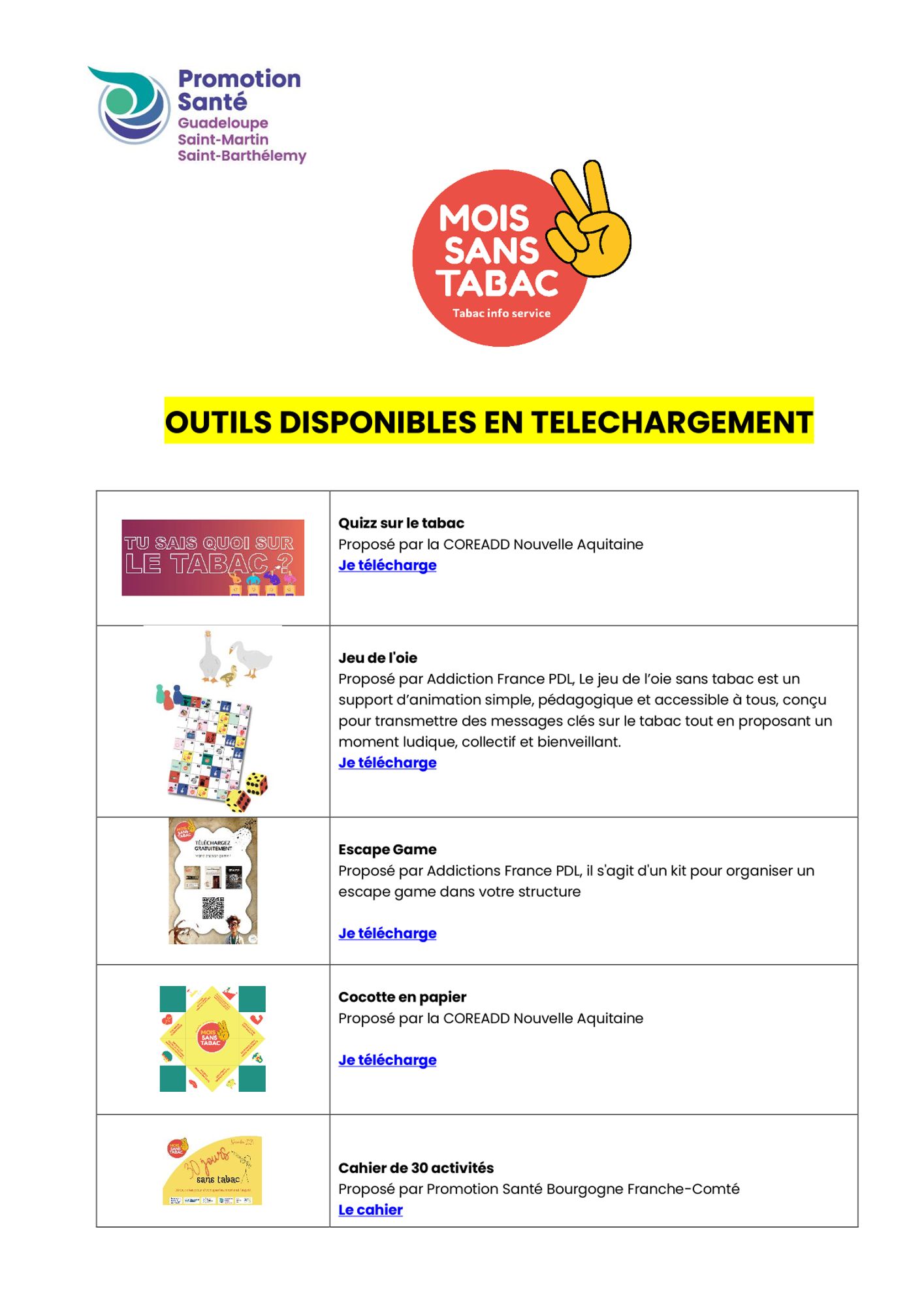 - Outils numériques et supports pédagogiques tels que magazines, jeux (escape game, jeu de l’oie sans tabac), et vidéos pour un accompagnement ludique et interactif.