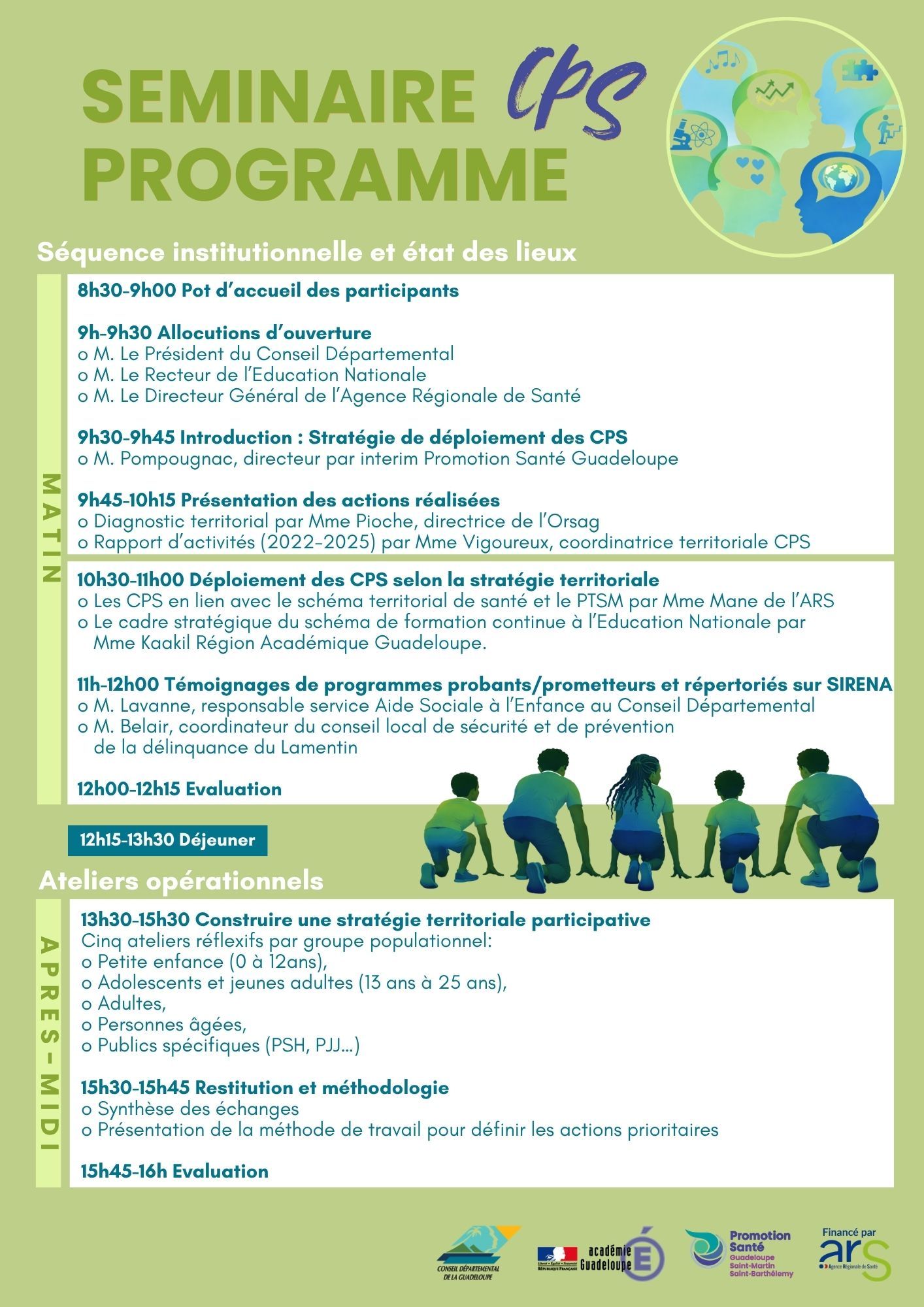Le Comité Territorial CPS, réunissant l’Agence Régionale de Santé, l’Éducation nationale, le Conseil départemental et Promotion Santé Guadeloupe, vous invite au premier Séminaire des acteurs engagés dans le développement des compétences psychosociales (CPS).