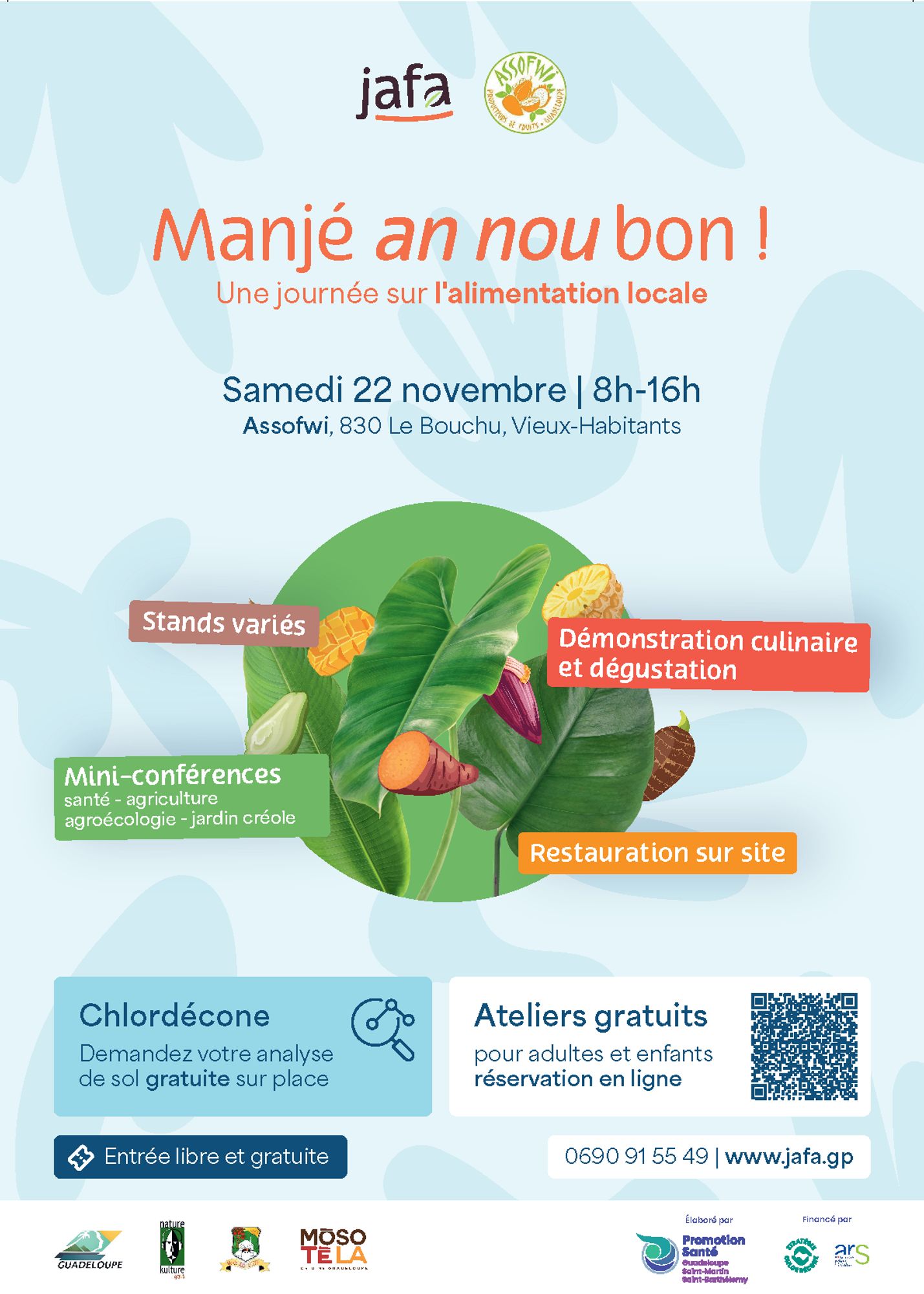 Organisée par Promotion Santé Guadeloupe, Saint-Martin et Saint-Barthélemy, en collaboration avec l’ASSOFWI, cette journée met à l’honneur le manger local, la santé , la valorisation de notre biodiversité et de nos produits « péyi » traditionnels et insolites.