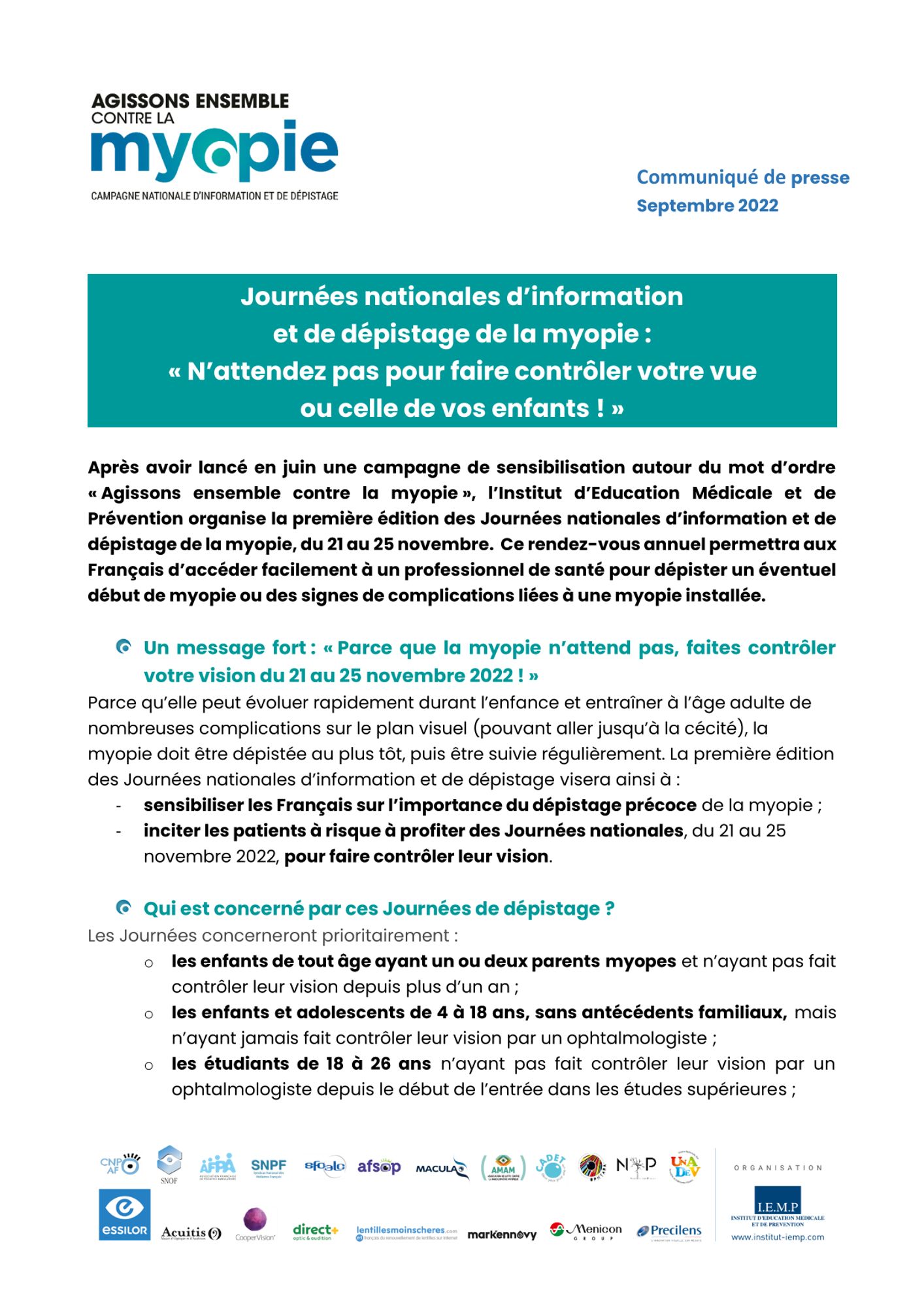 1ères Journées nationales d’information et de dépistage de la myopie - Agissons ensemble contre la myopie