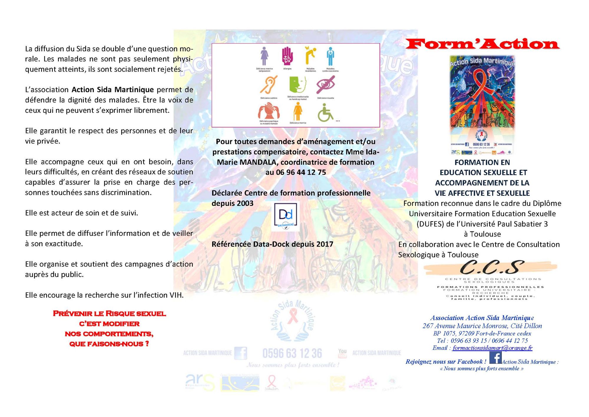 Il s'agit d'une formation proposée par Action Sida Martinique reconnue dans le cadre du Diplôme Universitaire Formation Éducation Sexuelle (DUFES) de l’Université Paul Sabatier 3 à Toulouse. En collaboration avec le Centre de Consultation Sexologique de Toulouse.