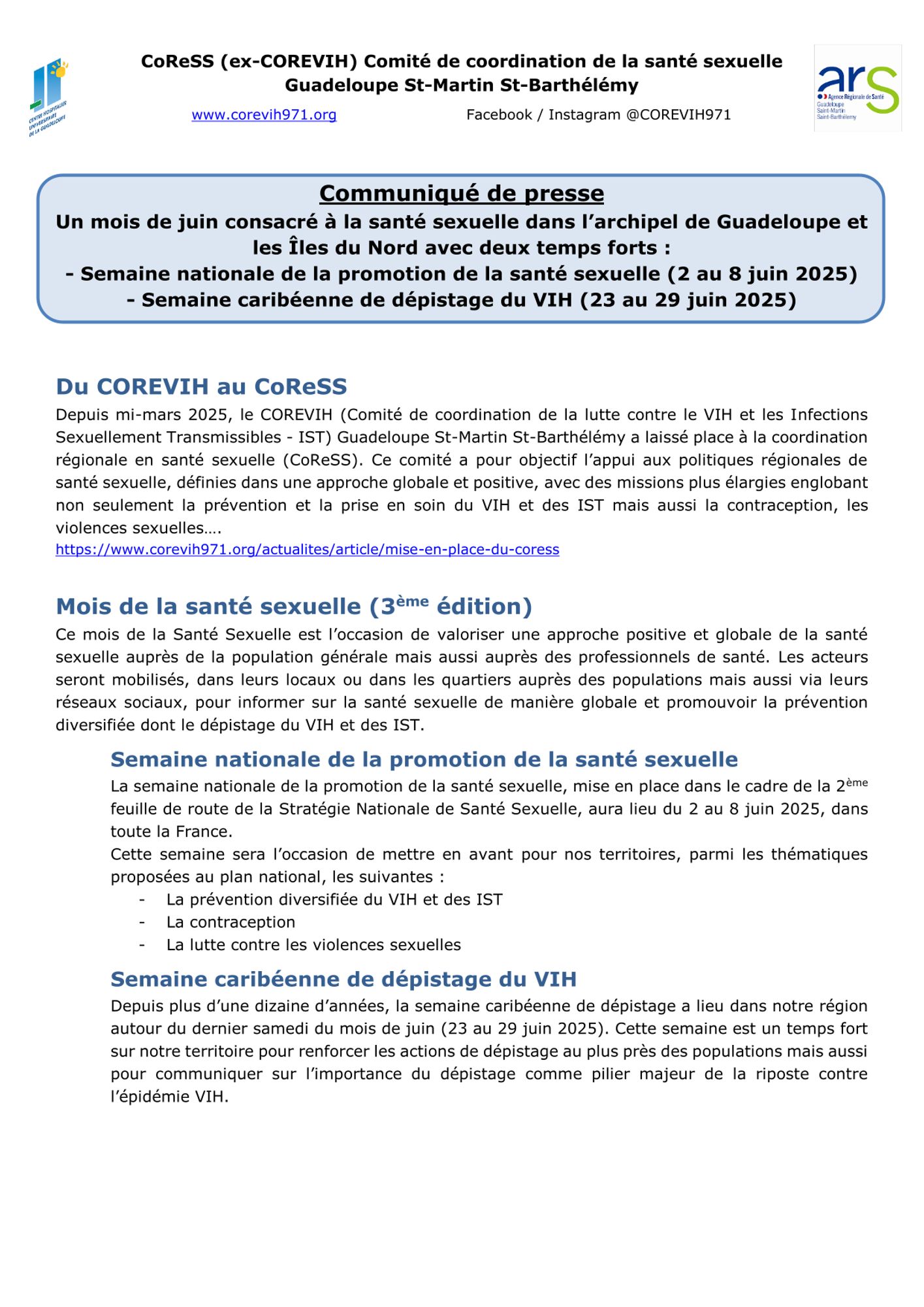 Depuis mi-mars 2025, le COREVIH (Comité de coordination de la lutte contre le VIH et les Infections Sexuellement Transmissibles - IST) Guadeloupe Saint-Martin Saint-Barthélémy a laissé place à la coordination régionale en santé sexuelle (CoReSS). Ce comité a pour objectif l’appui aux politiques régionales de santé sexuelle, définies dans une approche globale et positive, avec des missions plus élargies englobant non seulement la prévention et la prise en soin du VIH et des IST mais aussi la contraception, les violences sexuelles….