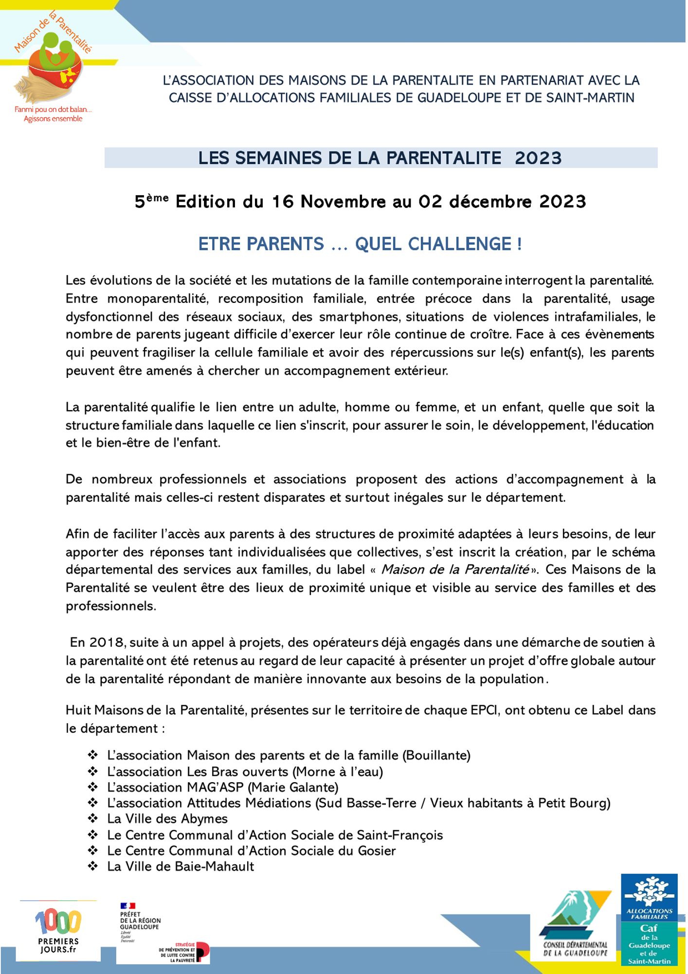 L'association des Maisons de la parentalité en partenariat avec la Caisse d'Allocations Familiales de la Guadeloupe et de Saint-Martin propose son programme d’animations dans le cadre de la 5ème édition des semaines de la parentalité sous la thématique: « Etre parents … Quel challenge ! ».