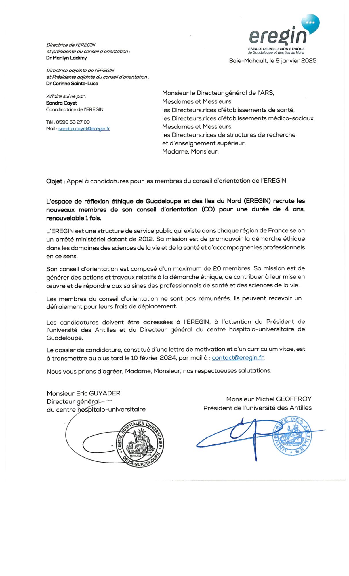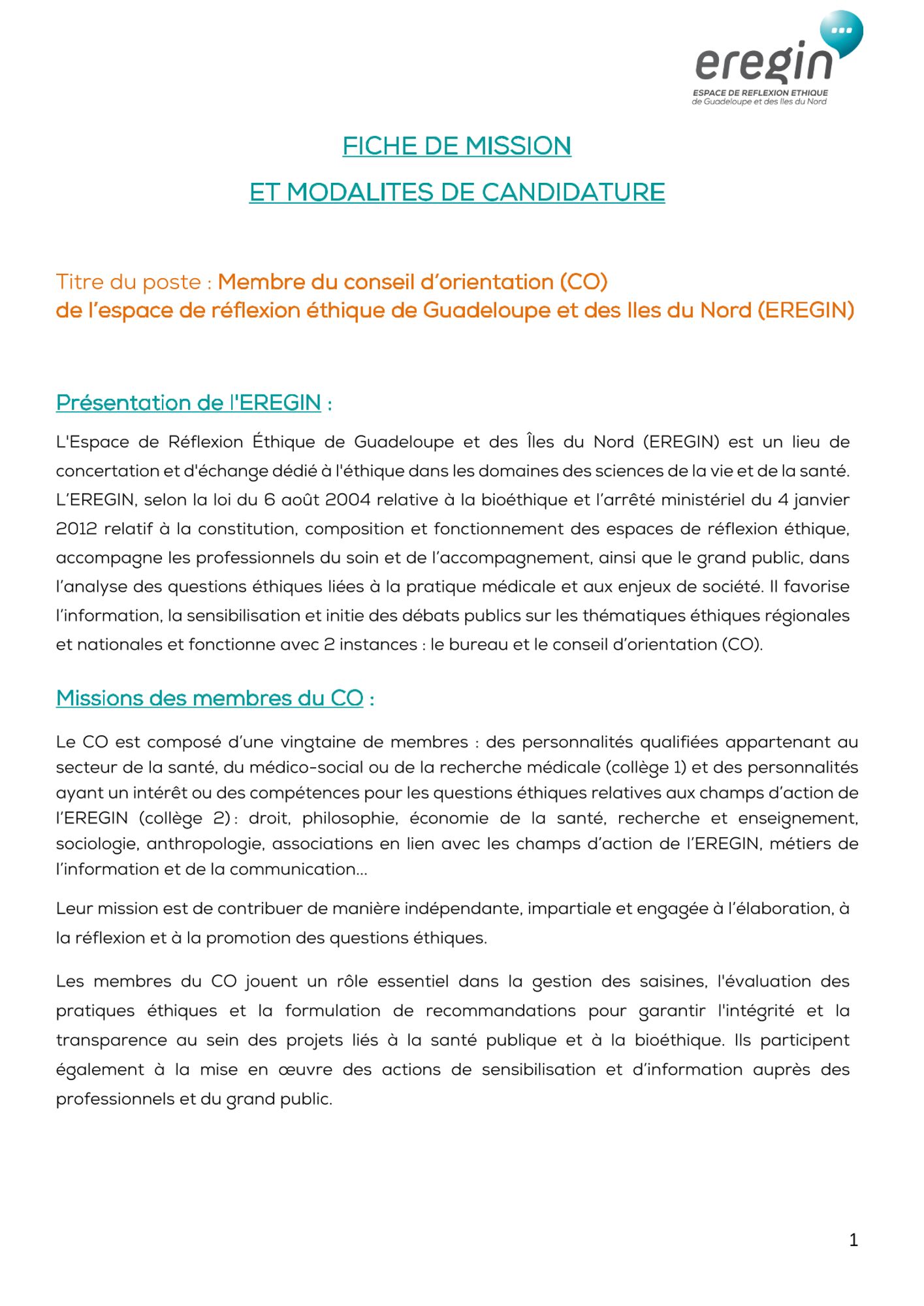 L'espace de réflexion éthique de Guadeloupe et des Îles du Nord (EREGIN) lance un appel à candidatures pour renouveler les membres de son conseil d'orientation (CO)., conformément à l’arrêté ministériel du 04 janvier 2012, relatif à la constitution, à la composition et au fonctionnement des espaces de réflexion éthique régionaux.