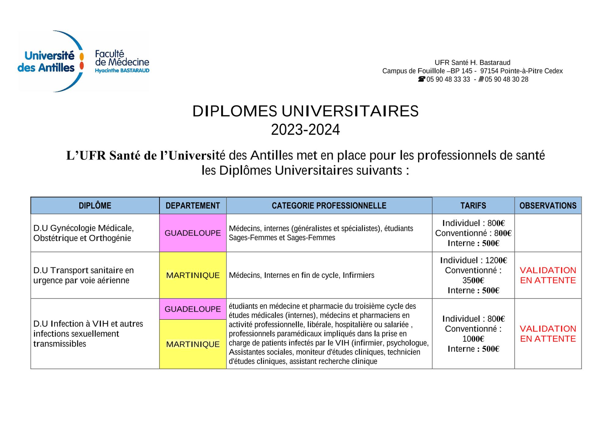 La Faculté de médecine de l'Université des Antilles a fait paraître la liste des diplômes universitaires universitaire agréés (et/ou en cours de validation) pour l'année 2023-2024, préparés sur les 2 départements (Guadeloupe, Martinique).