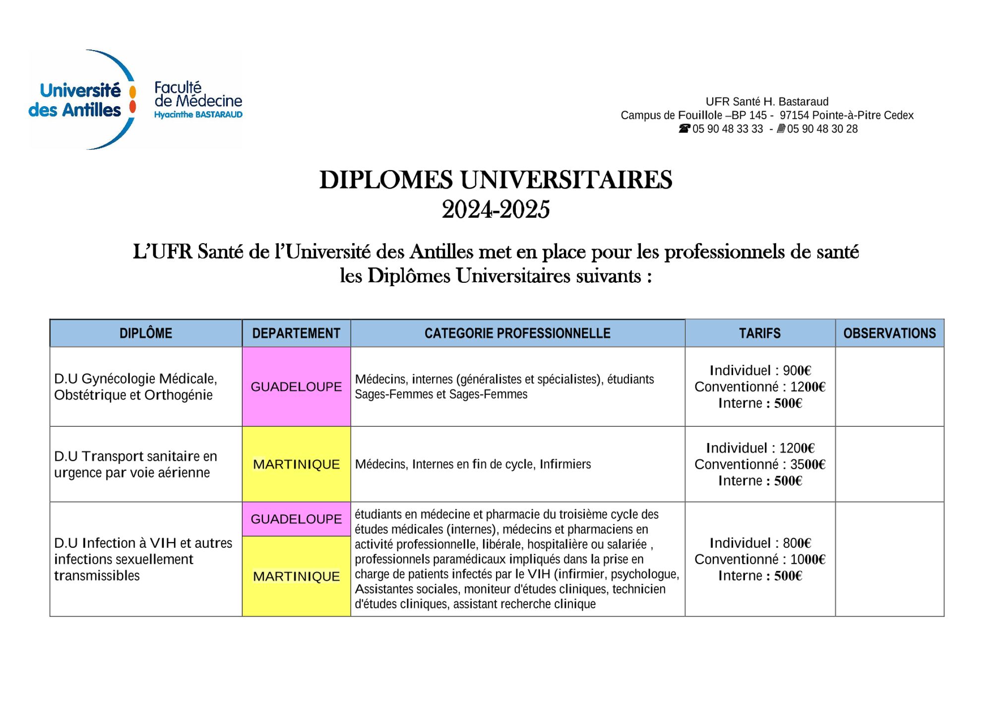 Liste des DU proposés par la Faculté de médecine de l'Université des Antilles - 2024-2025