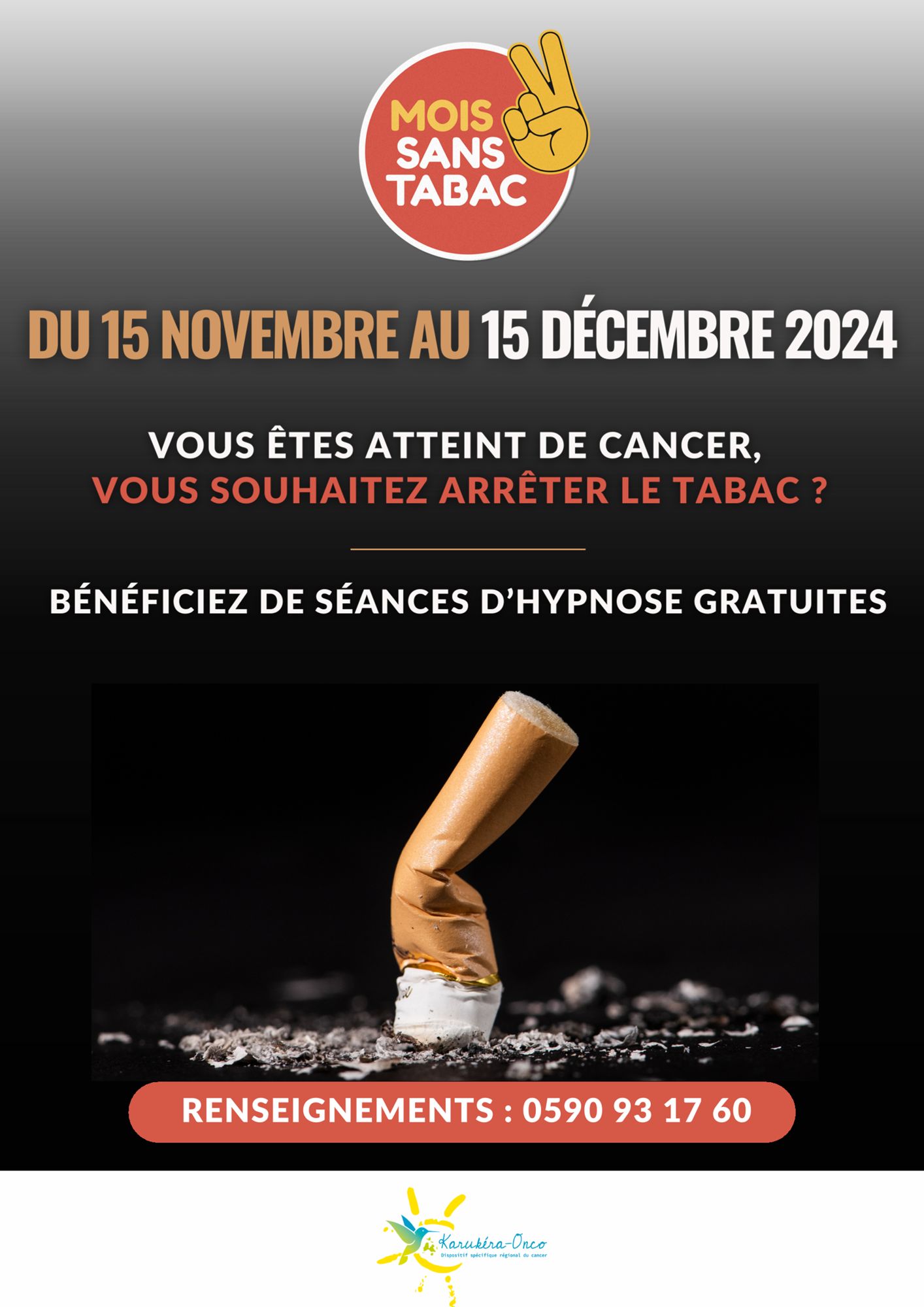 Dans le cadre du Mois Sans Tabac 2024, Karukéra Onco Dispositif Spécifique Régional du Cancer (DSRC) ou réseau régional en cancérologie annonce l'organisation de séances d'hypnose gratuites à destination des personnes atteintes de cancer qui souhaitent arrêter le tabac...