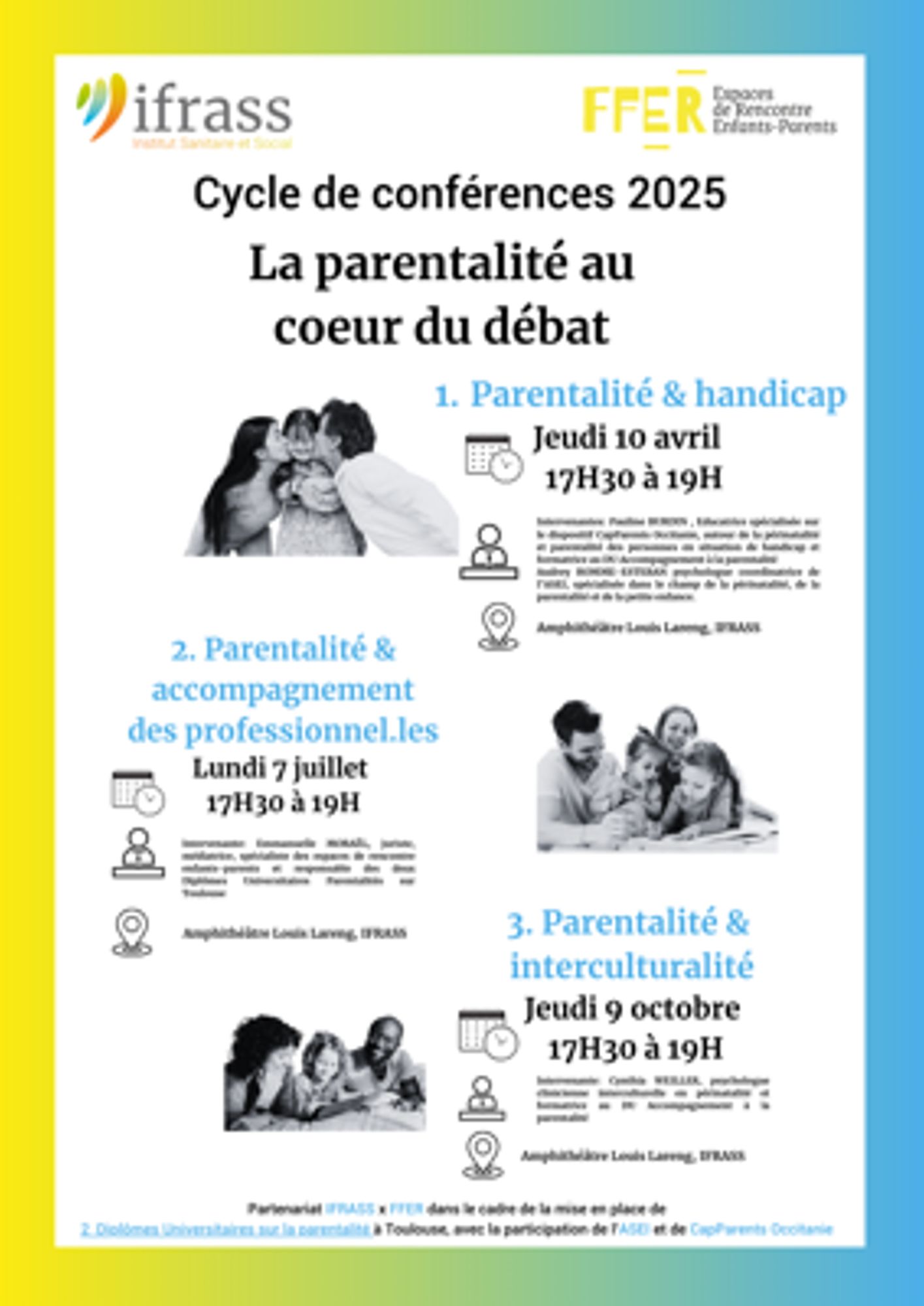 L'IFRASS et la FFédération Espaces de Rencontre Enffants-Parents (IFFER) proposent un cycle de conférences à Toulouse autour de la parentalité, dans le cadre du lancement d'un partenariat autour de 2 diplômes universitaires.