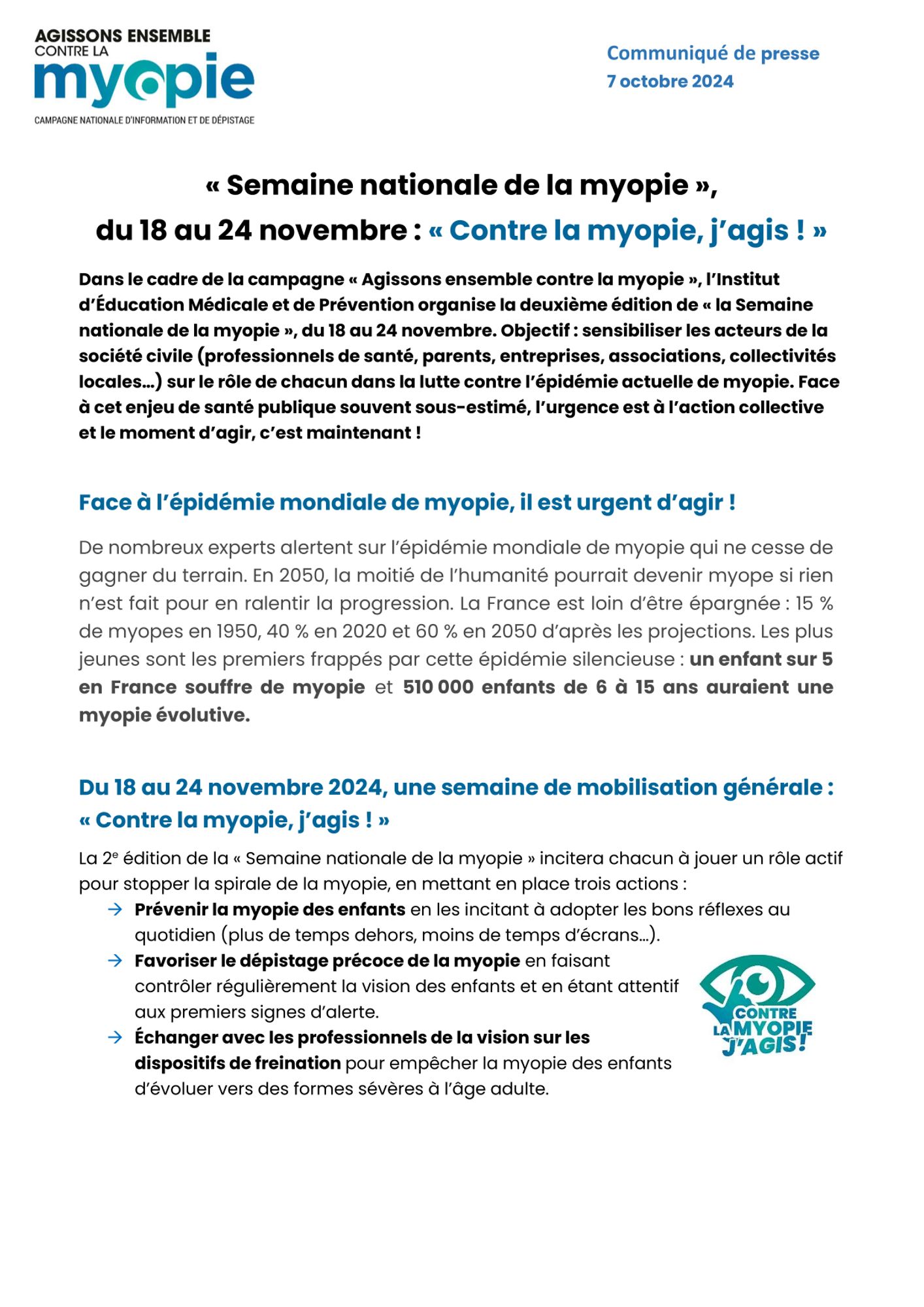 - L'organisation des "Etats Généraux de la myopie" le 19 novembre 2024 pour dresser l'état des lieux de l'épidémie et des moyens d'agir pour en ralentir la progression ;