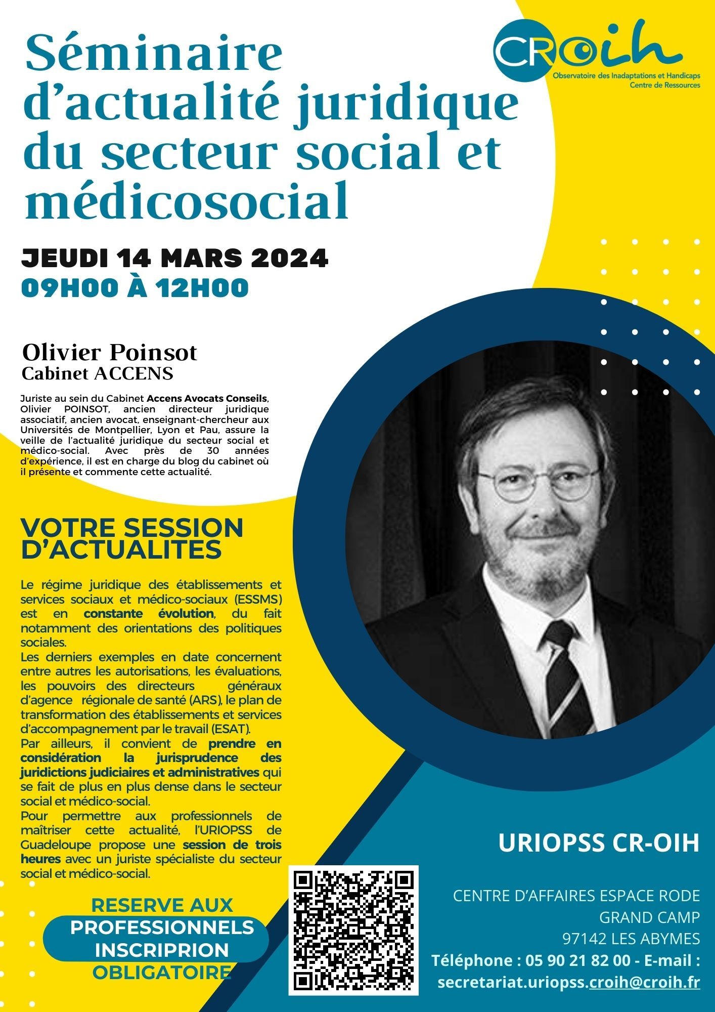 Le CR-OIH organise un séminaire professionnel intitulé "Actualités juridiques du secteur social et médicosocial" en collaboration avec Olivier POINSOT, Cabinet ACCENS.