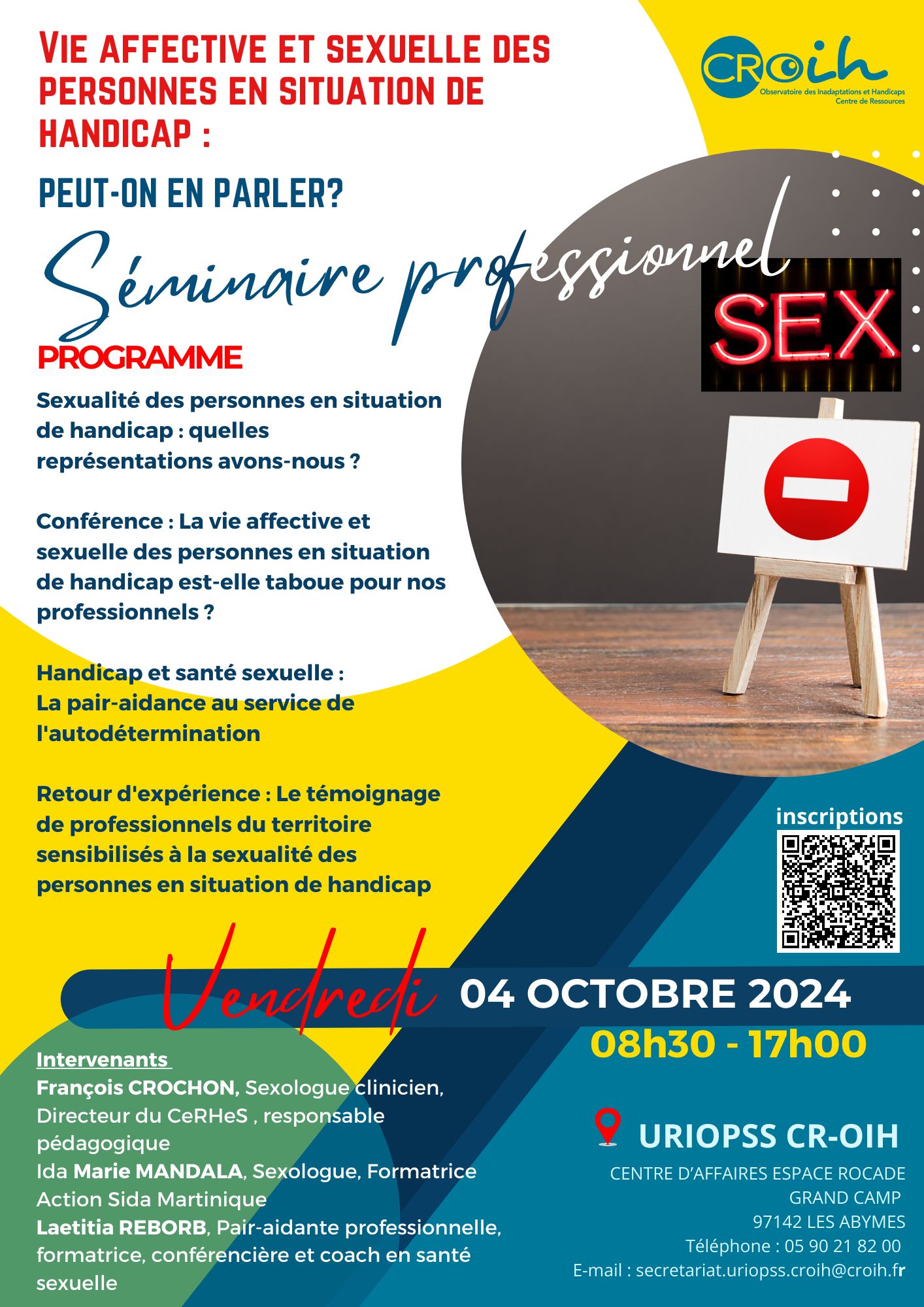 Le CR-OIH organise Le CR-OIH organise le 04 Octobre 2024 son séminaire professionnel "VIE AFFECTIVE ET SEXUELLE DES PERSONNES EN SITUATION DE HANDICAP, PEUT-ON EN PARLER ?"