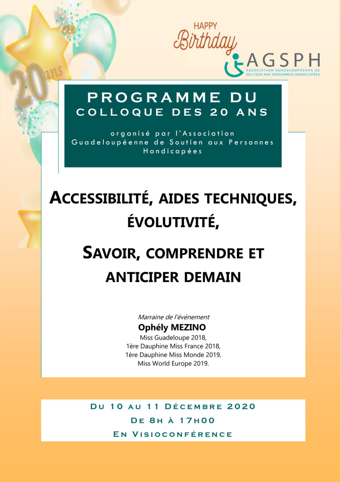 Organisé sur 2 jours, ce colloque organisé par l’Association Guadeloupéenne de Soutien aux Personnes handicapées (AGSPH) comporte des conférences Grands publics et des Tables rondes le Jeudi 10 décembre & Vendredi 11 décembre 2020