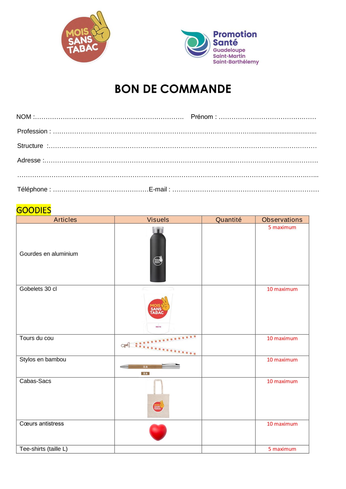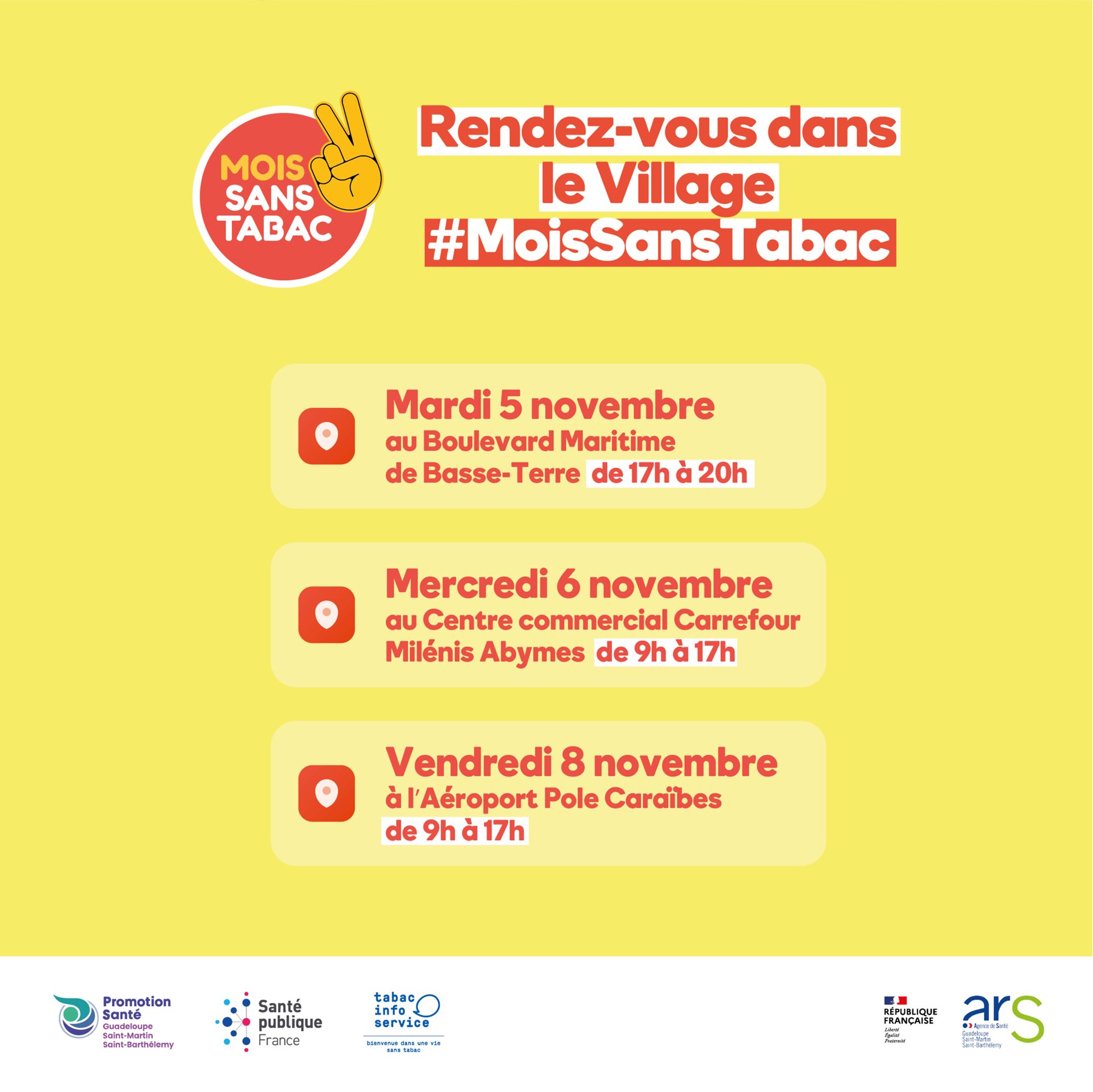 En Guadeloupe, Promotion Santé, la CGSS , l'Agence Régionale de Santé, les CSAPA et les professionnels de santé unissent leurs forces pour proposer des actions de terrain déployées pour être au plus proche des fumeurs. Comme partout en France, des stands Mois sans tabac seront installés pendant une journée dans des lieux de passage afin de fournir les informations utiles et accompagner les fumeurs dans leur démarche d’arrêt du tabac.