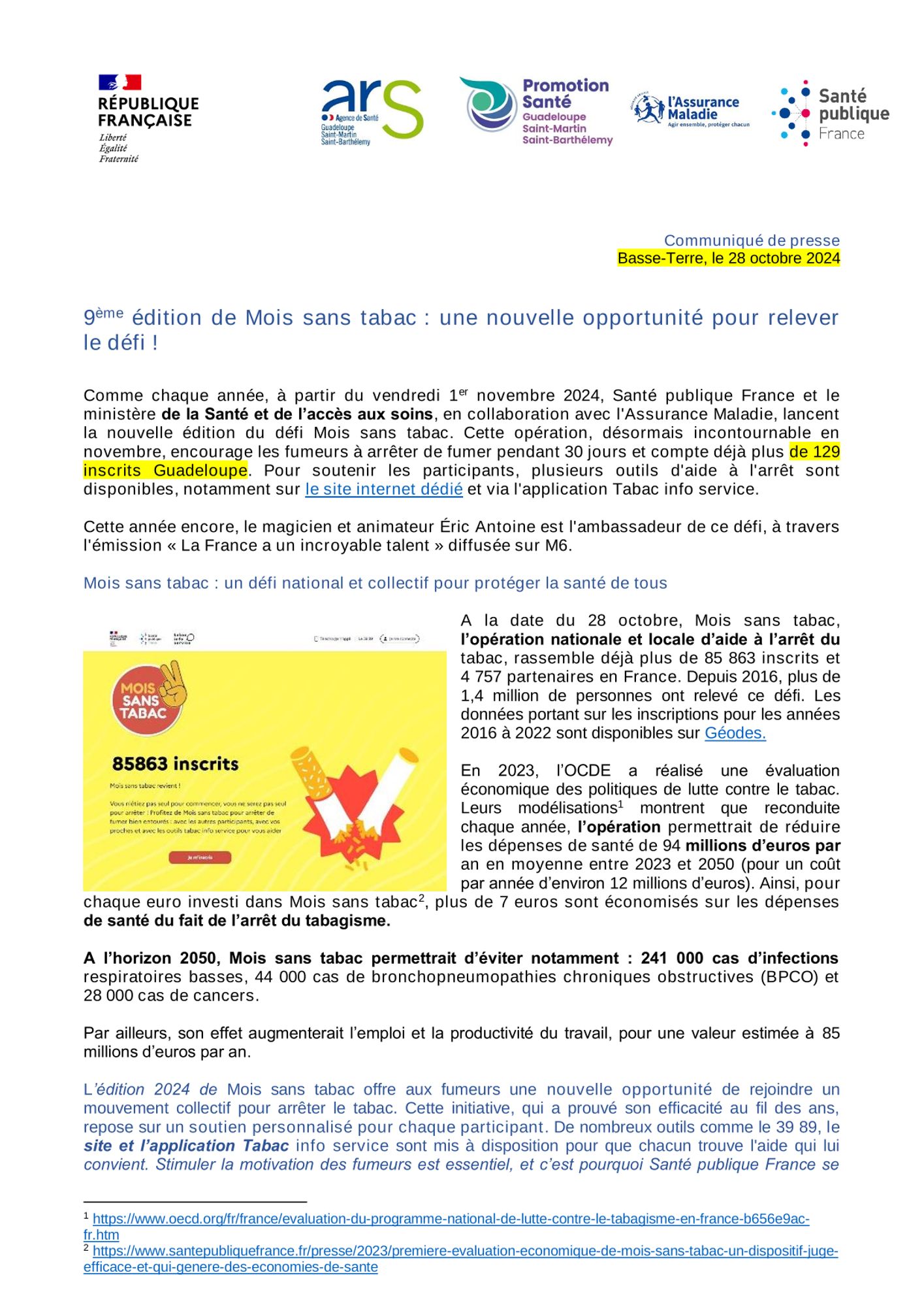 Comme chaque année, à partir du vendredi 1er novembre 2024, Santé publique France et le ministère de la Santé et de l’accès aux soins , en collaboration avec l'Assurance Maladie , lancent la nouvelle édition du défi Mois sans tabac. Cette opération, désormais incontournable en novembre, encourage les fumeurs à arrêter de fumer pendant 30 jours et compte déjà plus de 129 inscrits Guadeloupe. Pour soutenir les participants, plusieurs outils d'aide à l'arrêt sont disponibles. Pour soutenir les participants, plusieurs outils d'aide à l'arrêt sont disponibles, notamment sur le site internet dédié et via l'application Tabac info service.