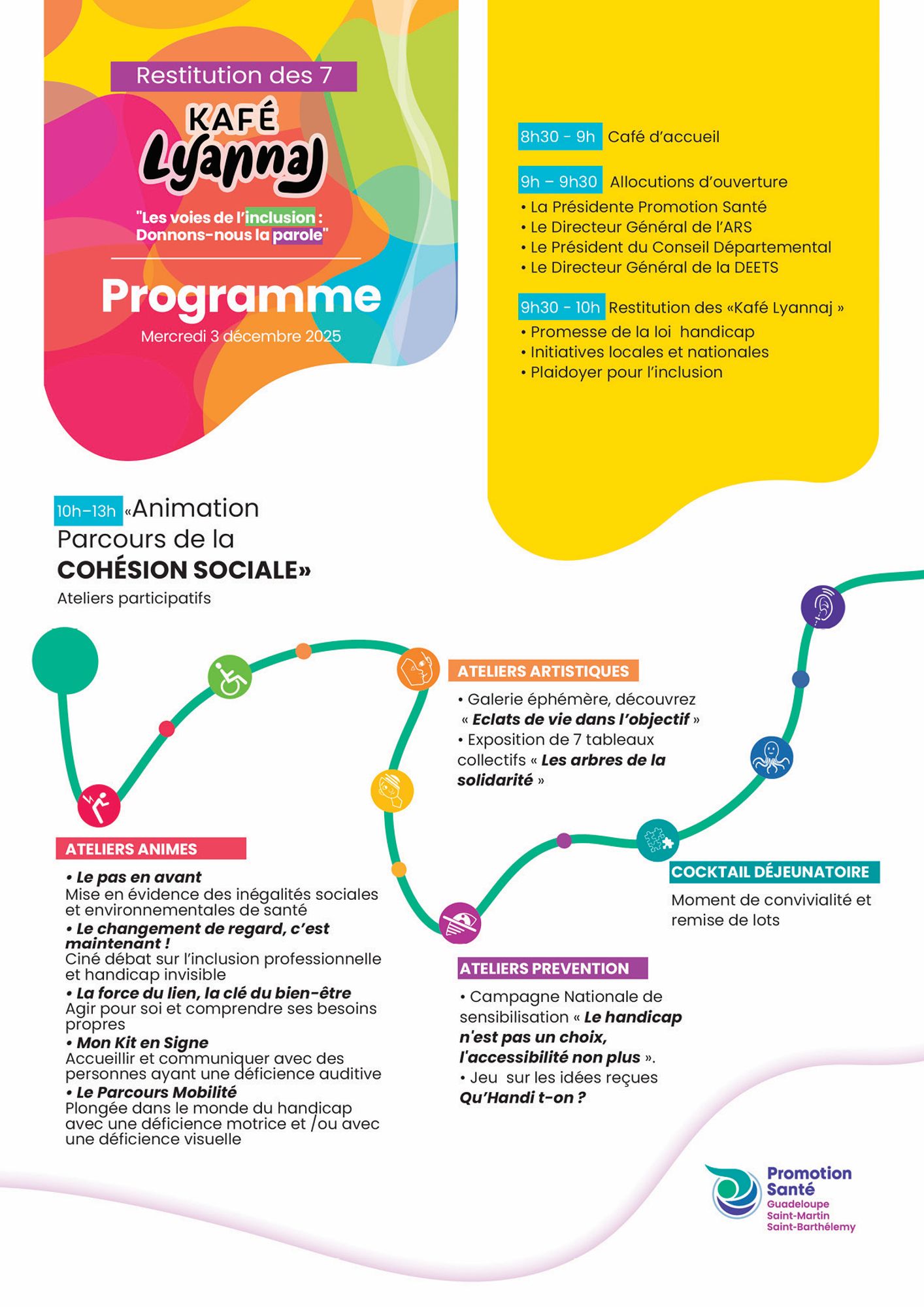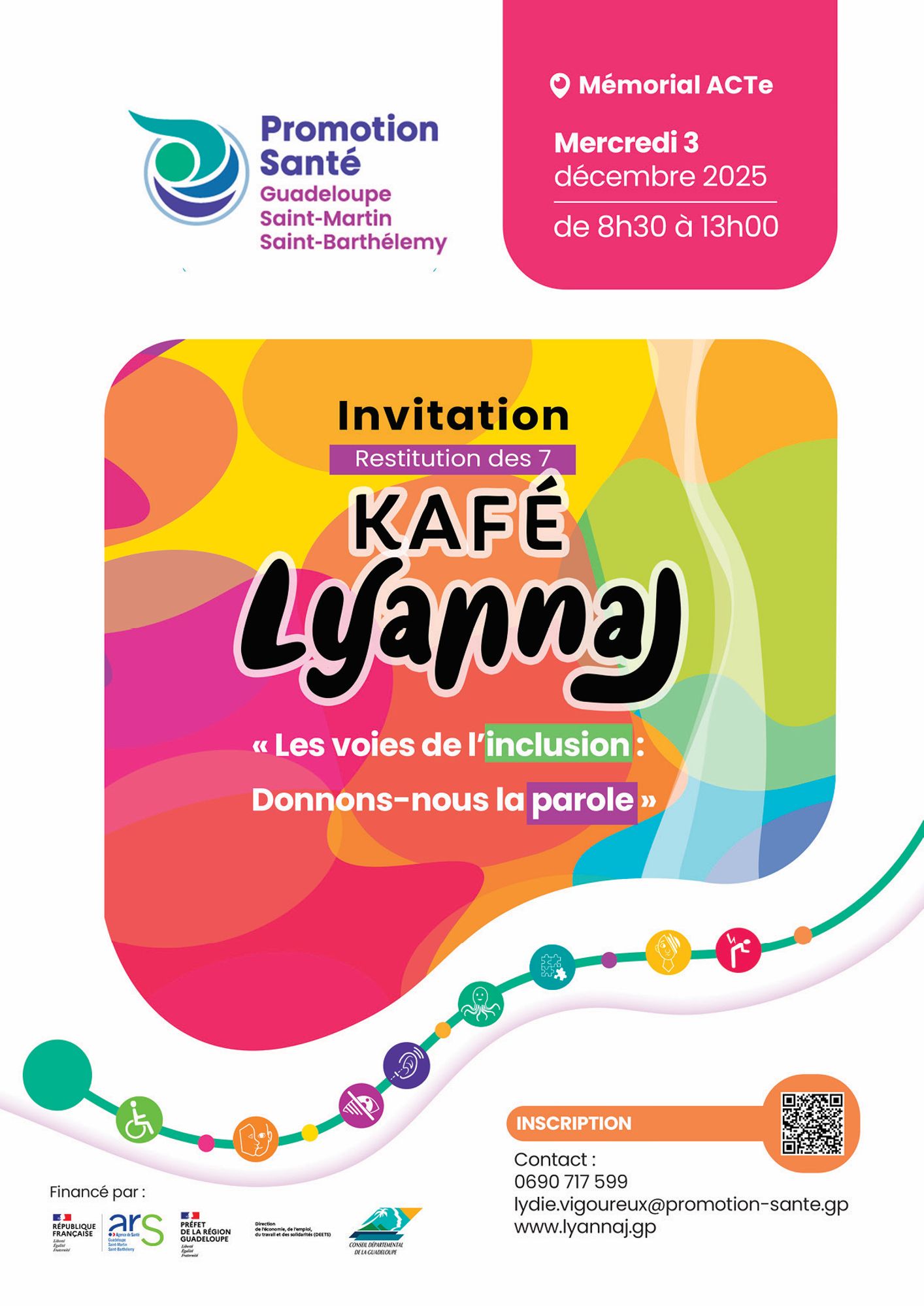 Au nom du groupe Cotech Malle Handi Santé, nous avons le plaisir de vous convier à la restitution des 7 Kafé Lyannaj qui se tiendra le mercredi 3 décembre 2025, de 8h30 à 13h, au Mémorial ACTe.
