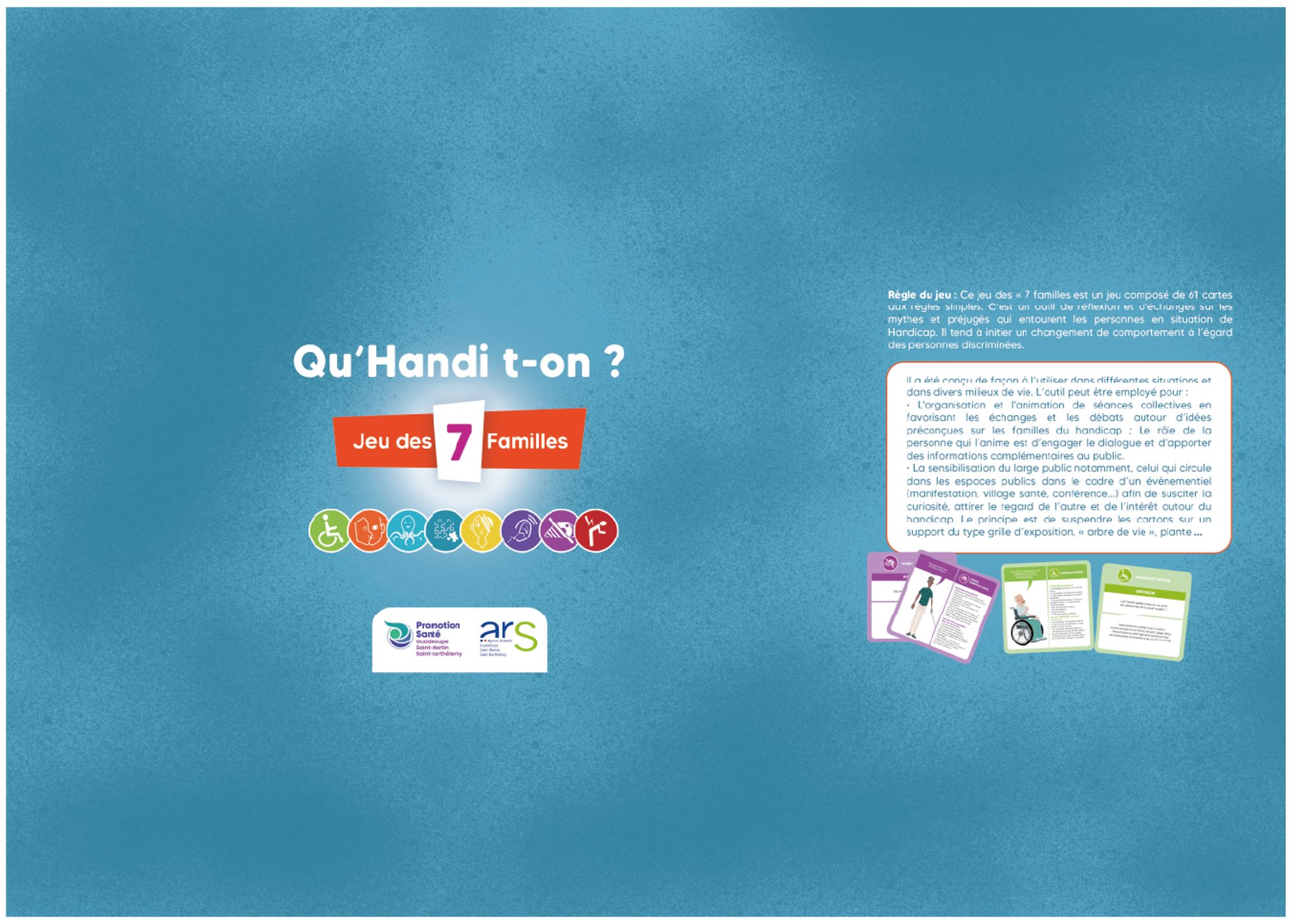 Ce jeu des « 7 familles de handicap » est un jeu composé de 61 cartes aux règles simples. C’est un outil de réflexion et d'échanges sur les mythes et préjugés qui entourent les personnes en situation de Handicap. Il tend à initier un changement de comportement à l’égard des personnes discriminées.