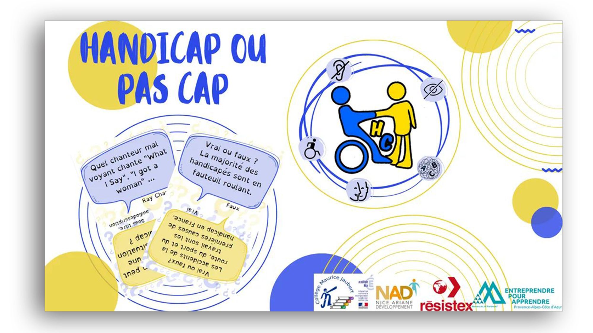 Ce support pédagogique est un jeu de sensibilisation abordant multiples sujets et utilisé pour des animations collectives lors d’événements, de manifestations et d’ateliers coopératifs. La principale activité est d’aborder l’évolution du regard sur le handicap et sa prise en charge d’un point de vue social et législatif.