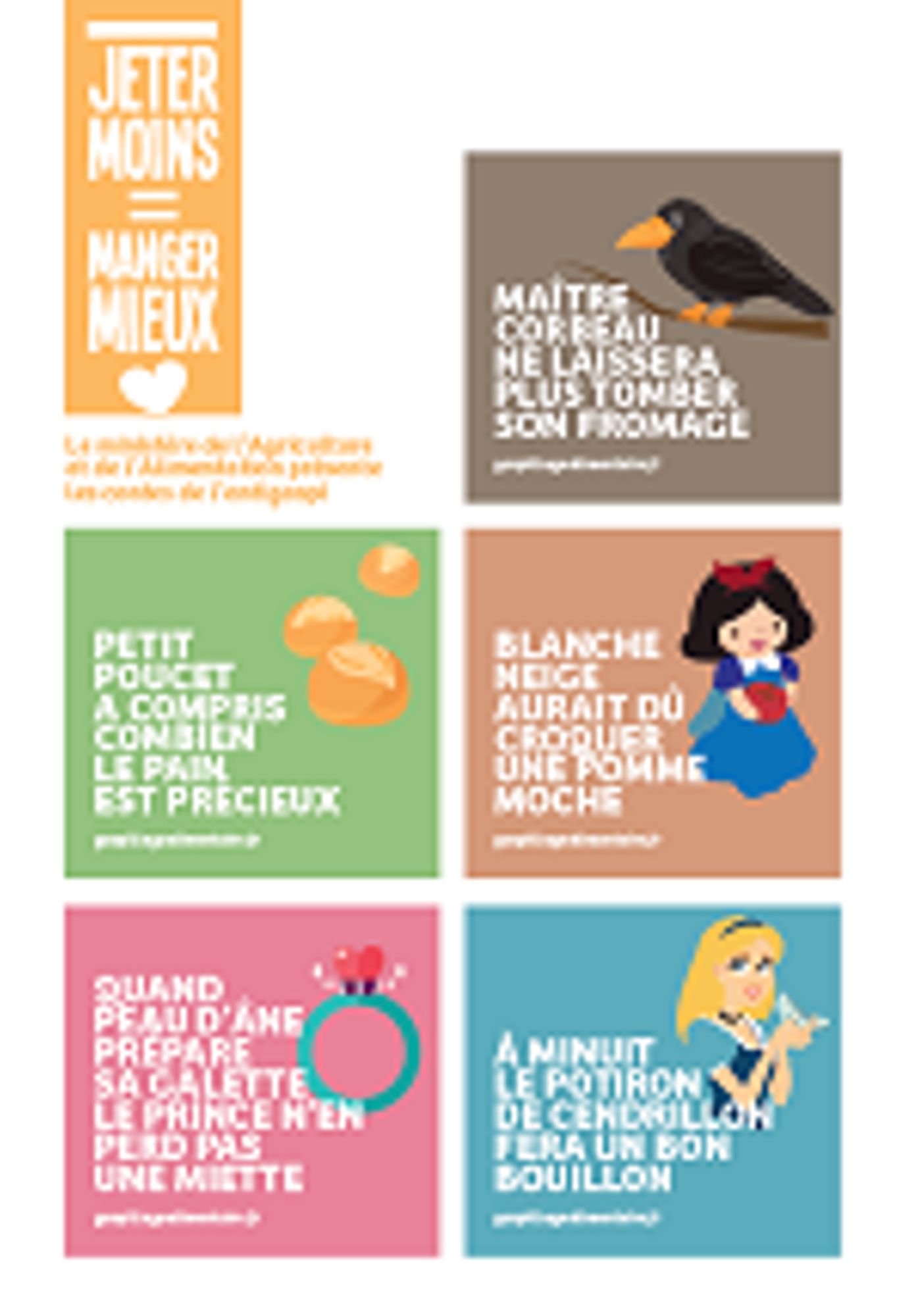 Tirée de la dernière campagne « ANTIGASPI » du ministère de l’agriculture et de l’alimentation, ce flyer met en scène les personnages mythiques des récits pour enfants pour énumérer les 10 gestes à adopter contre le gaspillage alimentaire.