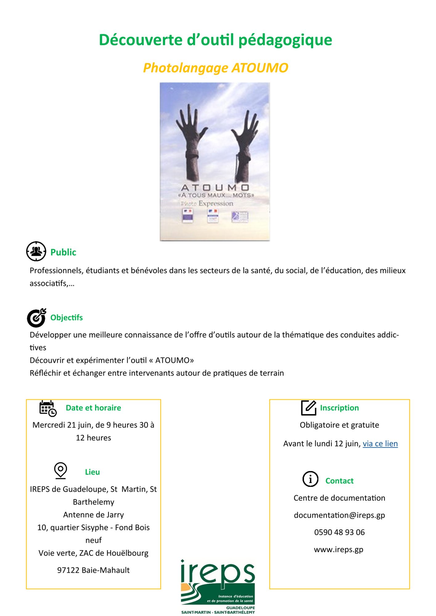 A l’occasion de la Journée Internationale contre l'abus et le trafic de Drogues, l’IREPS vous invite à découvrir l’outil d’intervention « Atoumo "A tous maux... mots" ». Un photolangage qui vous permettra d’aborder le thème de la consommation de produits psychoactifs et des conduites à risque avec votre public (jeunes, adultes, familles…)