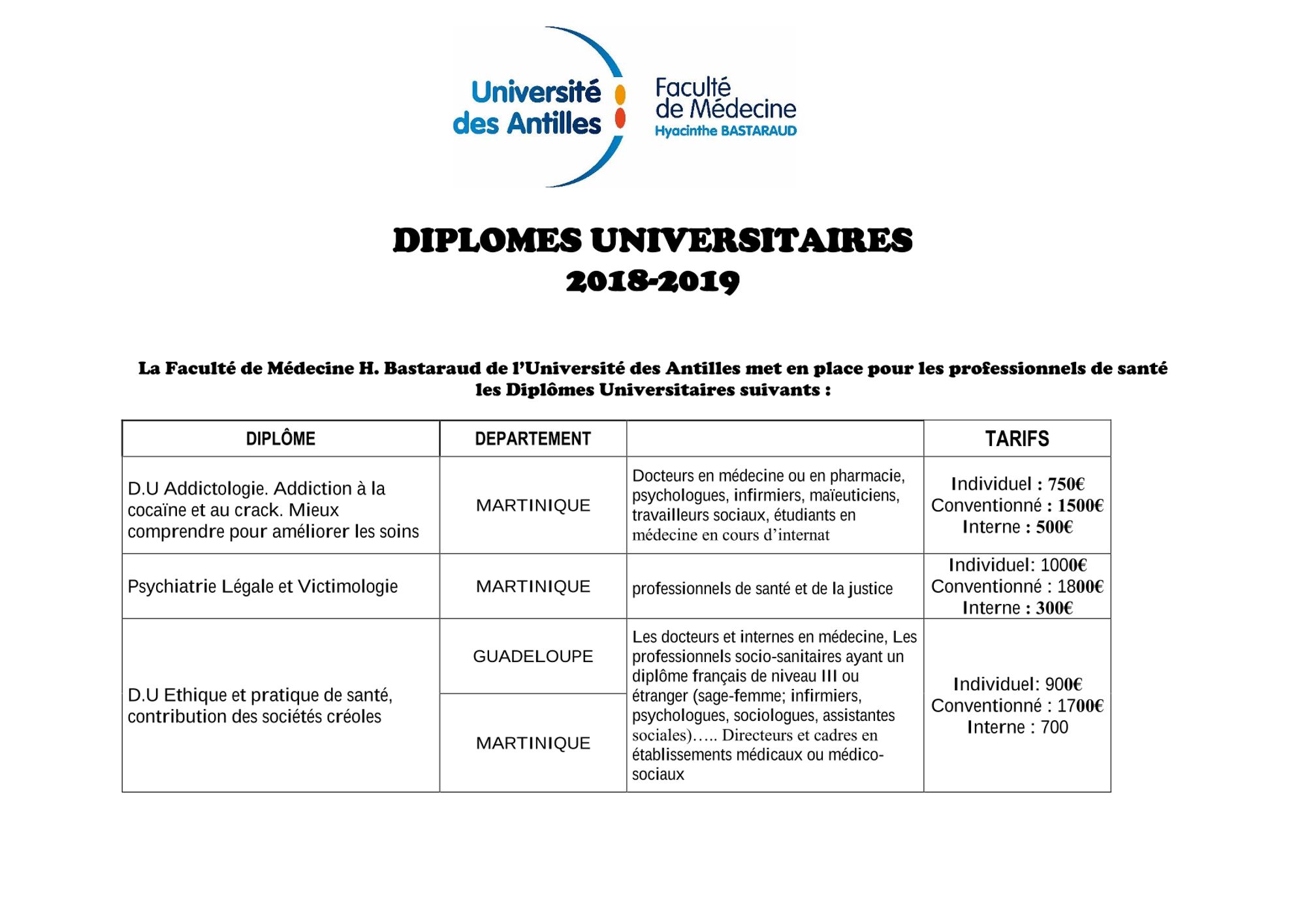 11/09/2018 - Liste des DU et DIU proposés en 2018-2019 par la Faculté de médecine de l'Université des Antilles