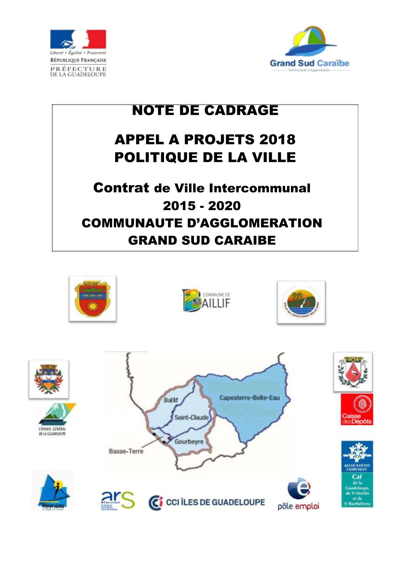 La Communauté d’Agglomération Grand Sud Caraïbe, informe les porteurs de projets de Baillif, Basse-Terre, Capesterre-Belle-Eau, Gourbeyre et Saint-Claude, de l’ouverture d’un appel à projets pour la mise en place de la Programmation annuelle 2018 du Contrat de ville Intercommunal.