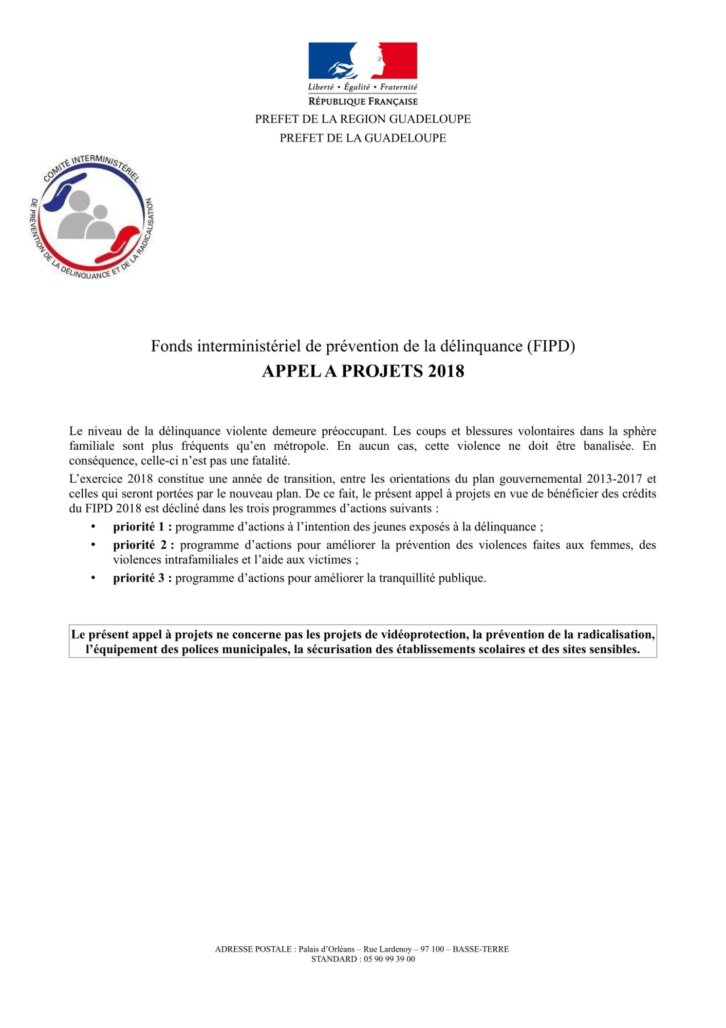 Appel à projets 2018 pour la prévention de la délinquance - Préfecture Région Guadeloupe