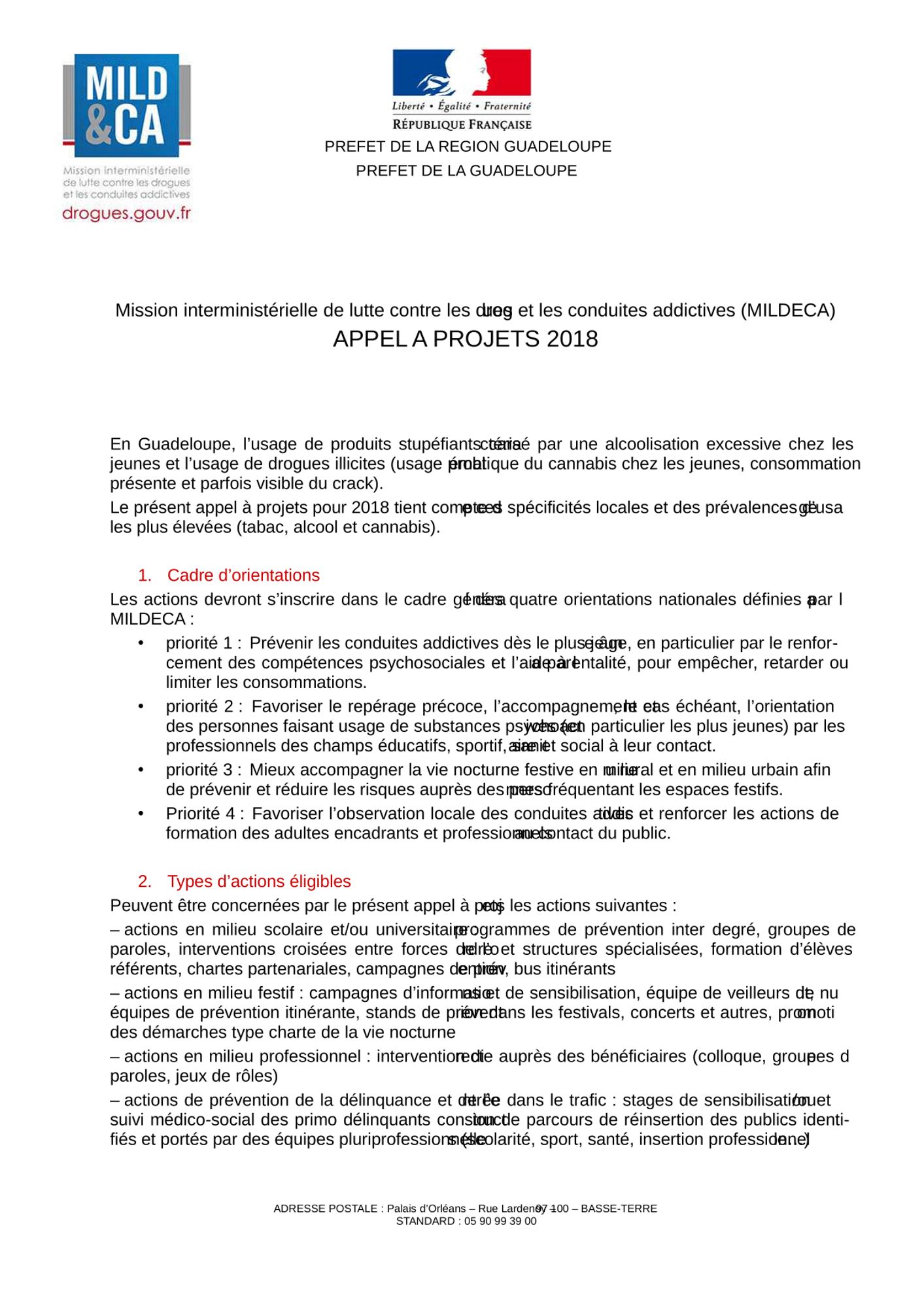 Plus de détail dans cahier des charges de l'appel à projet 2018 de la MILDECA en ligne sur le site de la Préfecture de région Guadeloupe