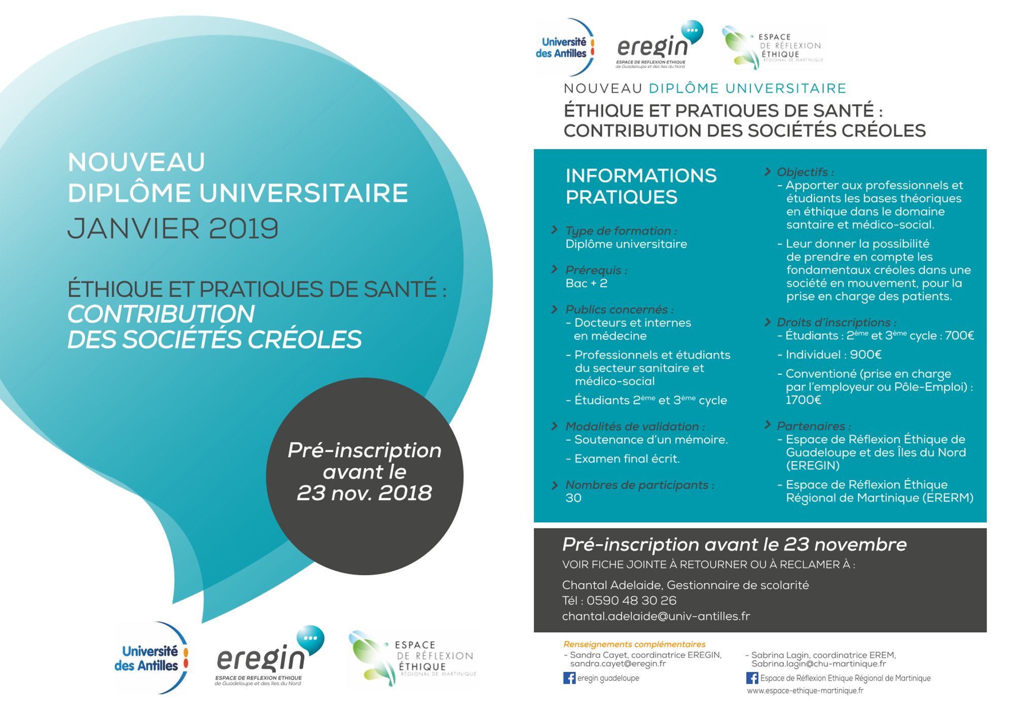 Ce DU, organisé par l’Espace de réflexion éthique de Guadeloupe et des Iles du Nord (EREGIN) en lien avec l’Espace de réflexion éthique régional de Martinique et l’Université des Antilles, est accessible aux docteurs et internes en médecine, aux professionnels et étudiants du secteur sanitaire et médico-social, et aux étudiants de 2eme et 3eme cycle dans le domaine des sciences humaines.