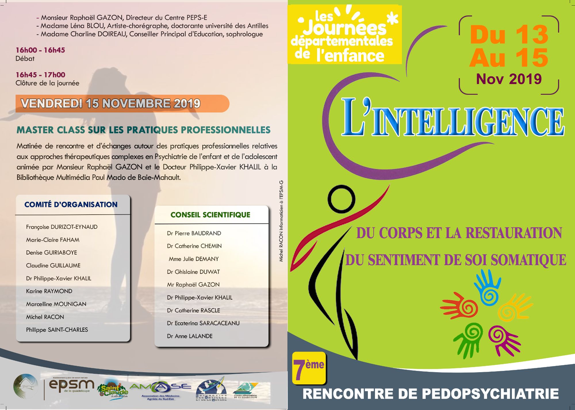 Dans le cadre de la seizième édition des journées départementales de l’enfance du 13 au 15 novembre 2019, la 7ème rencontre de pédopsychiatrie organisée par le Collège de pédopsychiatrie de Guadeloupe, l'Etablissement de Santé mentale de la Guadeloupe (EPSM) se tiendra sur les thème de "L'intelligence - Du corps et la restauration du sentiment de soi somatique".