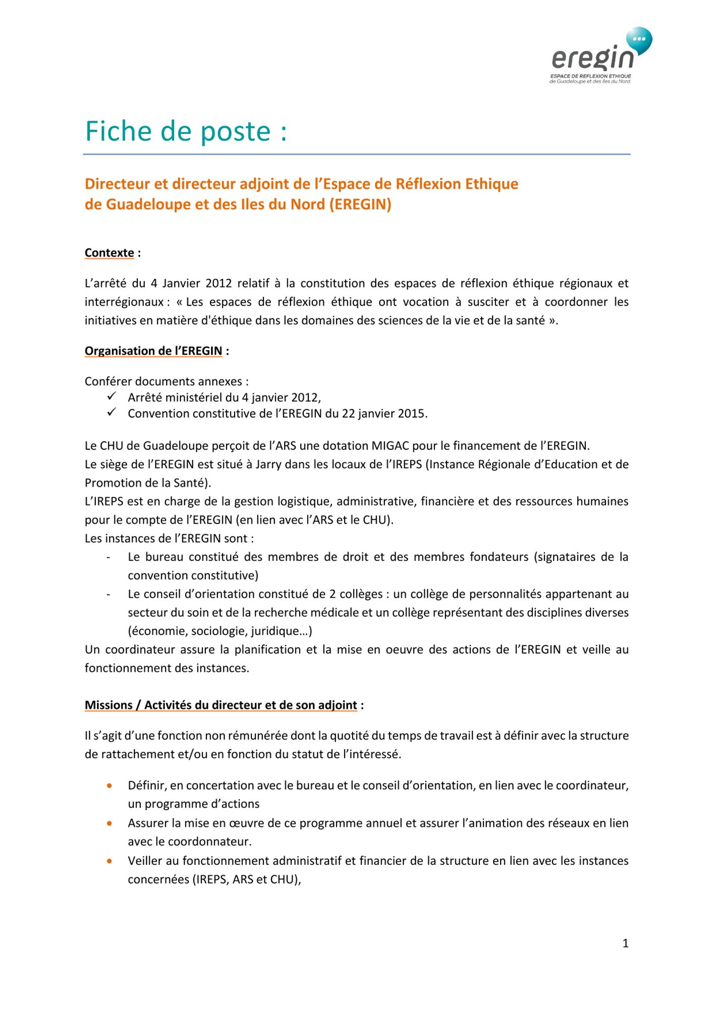 Pour plus de détail, consulter la fiche de poste de Directeur et directeur adjoint de l'Espace de Réflexion Ethique de Guadeloupe et des Iles du Nord (EREGIN).