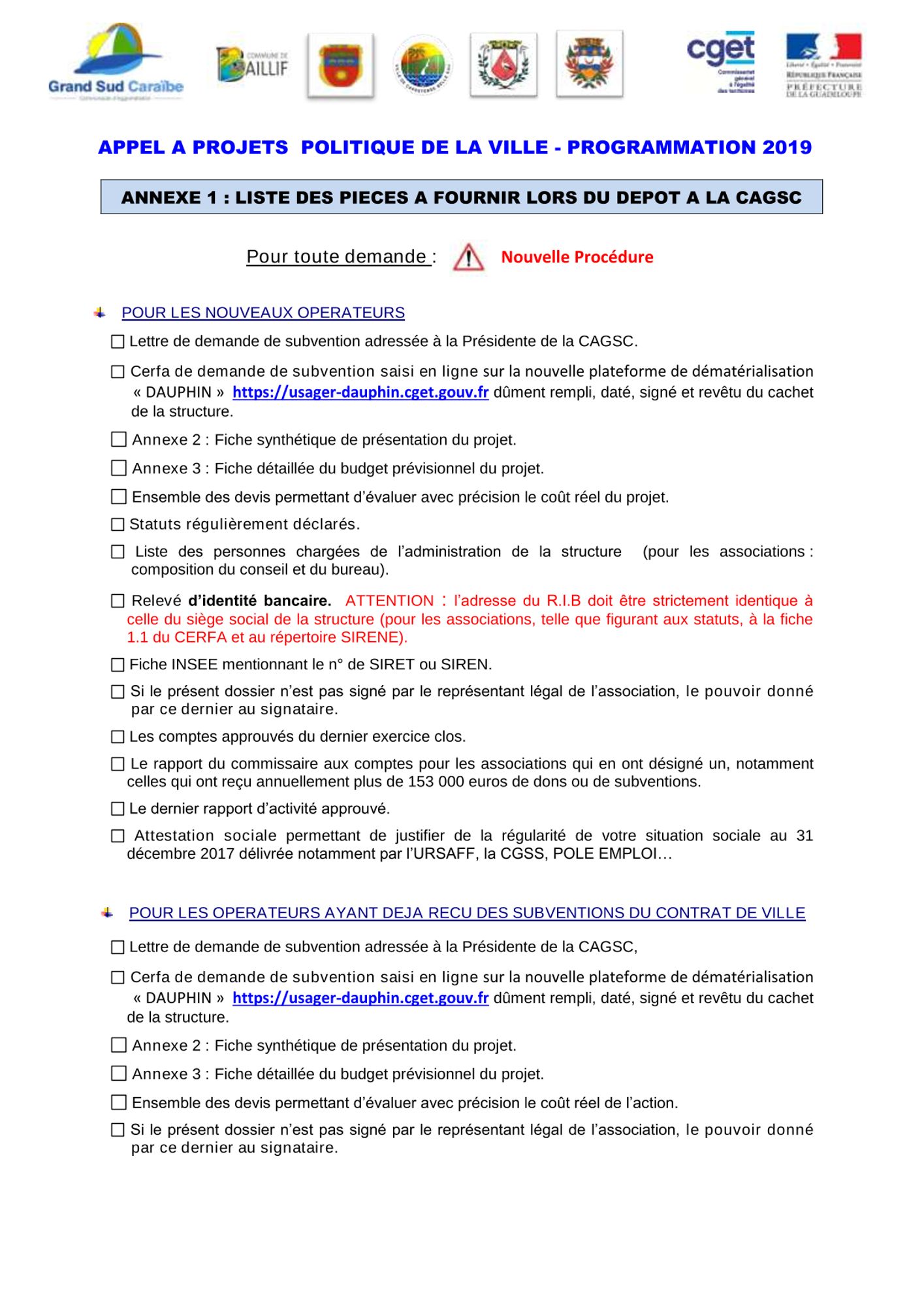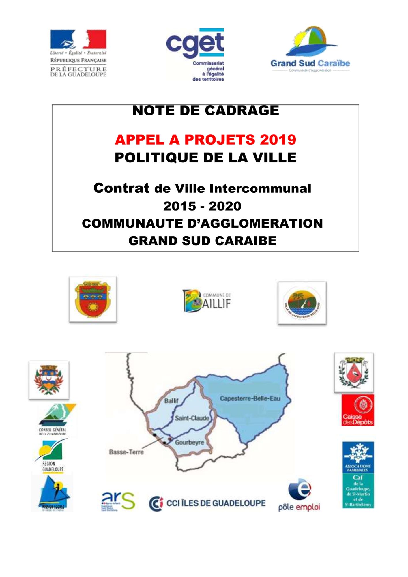 La Communauté d’Agglomération Grand Sud Caraïbe, informe les porteurs de projets de Baillif, Basse-Terre, Capesterre-Belle-Eau, Gourbeyre et Saint-Claude, de l’ouverture d’un appel à projets pour la mise en place de la Programmation annuelle 2019 du Contrat de ville Intercommunal.